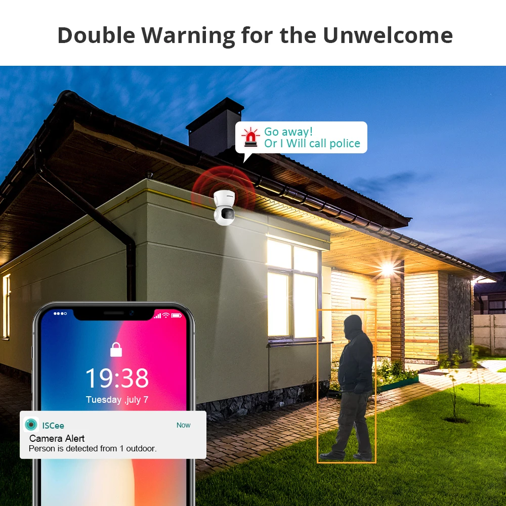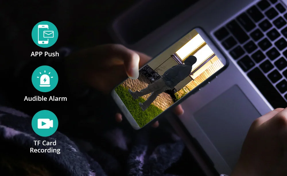 Una vez que se detecta un intruso, la sirena de la cámara se activará o activará manualmente para asustar a los ladrones, y enviará oportunamente las notificaciones de alarma a su teléfono móvil. Grabación de eventos en tarjeta Micro SD o almacenamiento en la nube. Ya no se preocupe por perderse ningún evento de emergencia.