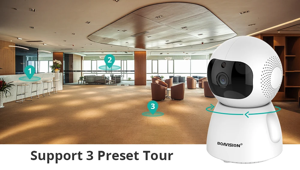 Puede configurar 3 posiciones preestablecidas como la ubicación que se ve con frecuencia, inicie la función de recorrido. La cámara comenzará a trabajar en modo de recorrido.