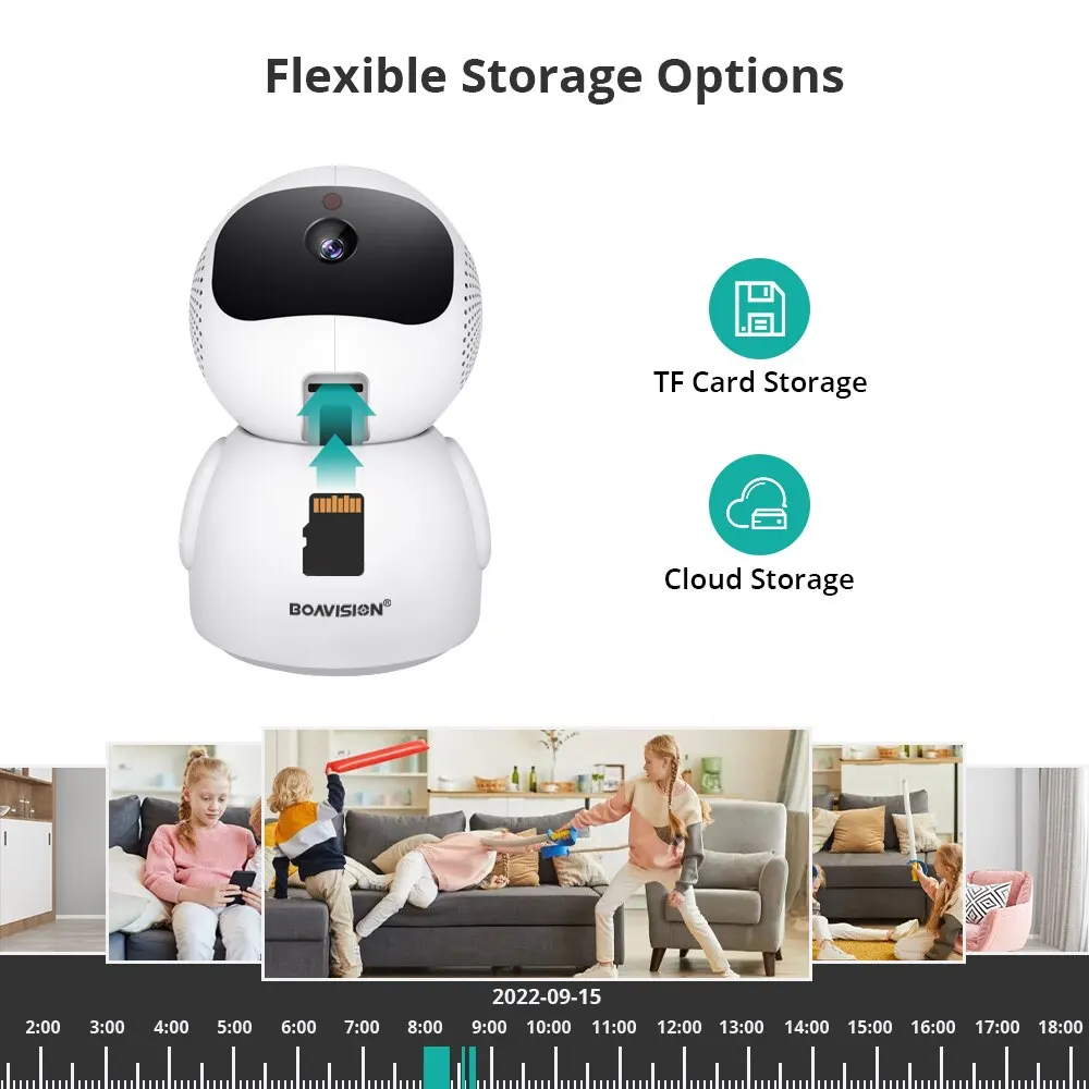 Una vez que se detecta un intruso, la sirena de la cámara se activará o activará manualmente para asustar a los ladrones, y enviará oportunamente las notificaciones de alarma a su teléfono móvil. Grabación de eventos en tarjeta Micro SD o almacenamiento en la nube. Ya no se preocupe por perderse ningún evento de emergencia.