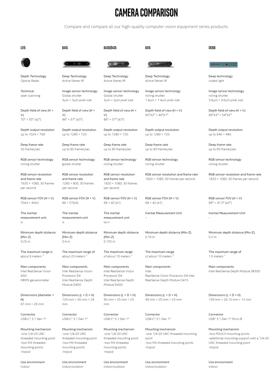 La Intel® RealSense™ La cámara de la serie D400 tiene un diseño portátil que es fácil de instalar, admite resolución de alta profundidad e incluye un sensor de profundidad estéreo infrarrojo activo con campo de visión estándar o amplio.Para aplicaciones de alta precisión, elija D415 con persiana enrollable.Si se trata de una escena de aplicación en movimiento rápido o en exteriores, elija una cámara D435 o D435i con obturador global.