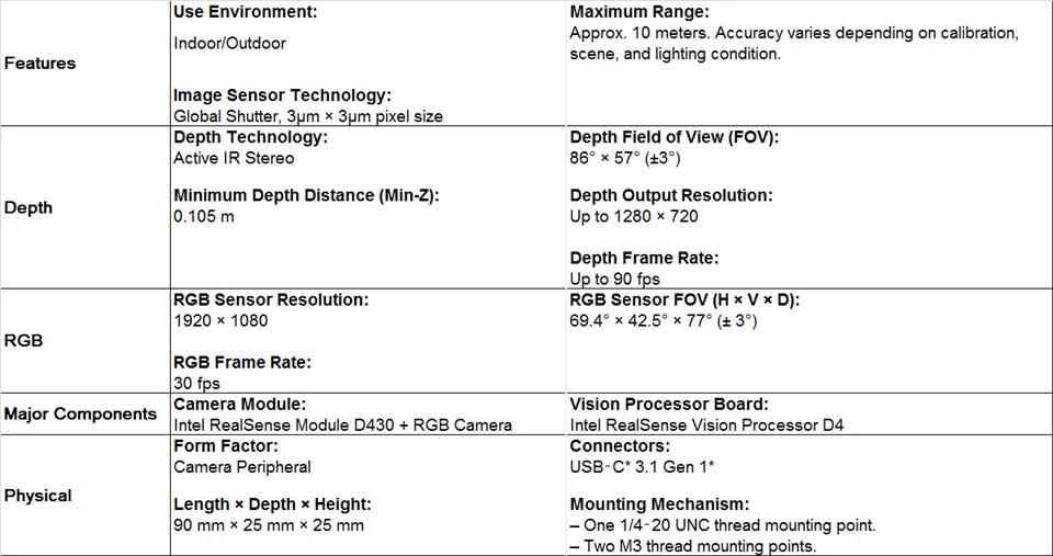 La serie de cámaras D400, una línea que utiliza el último hardware y software de detección de profundidad de Intel las empaqueta en productos fáciles de integrar.Perfecto para desarrolladores, creadores e innovadores que buscan aportar detección de profundidad a dispositivos, Intel® RealSense™ Las cámaras de la serie D400 ofrecen una integración sencilla lista para usar y permiten una generación completamente nueva de dispositivos inteligentes equipados con visión.