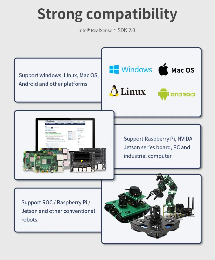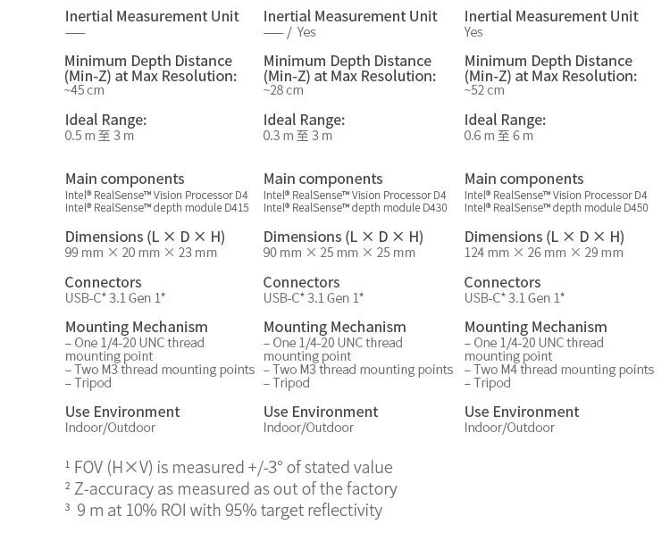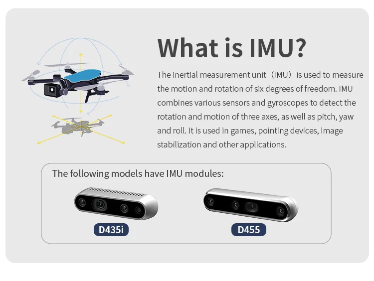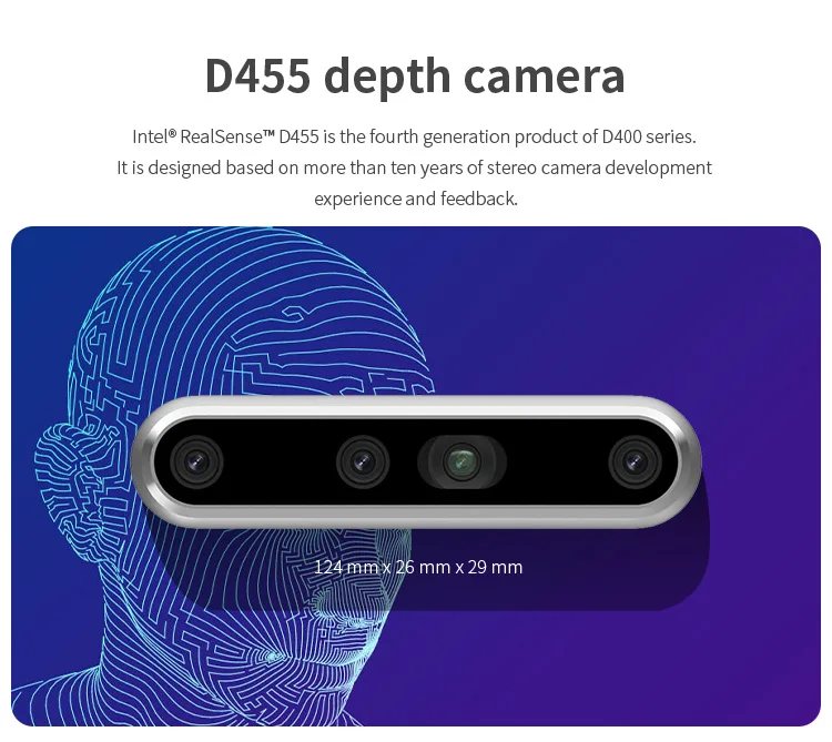 En comparación con otros modelos de cámaras de profundidad, la precisión y el alcance de la cámara de profundidad D455 se han mejorado enormemente.Basado en el software RealSense SDK 2.0, está conectado con la interfaz USB-C, que se puede integrar fácilmente en el sistema existente.Tiene visión estéreo y es capaz de medir la profundidad.RealSense D455 no solo admite seguimiento de movimiento, sino que también es adecuado para una gama más amplia de aplicaciones como robótica y seguro médico.Característica