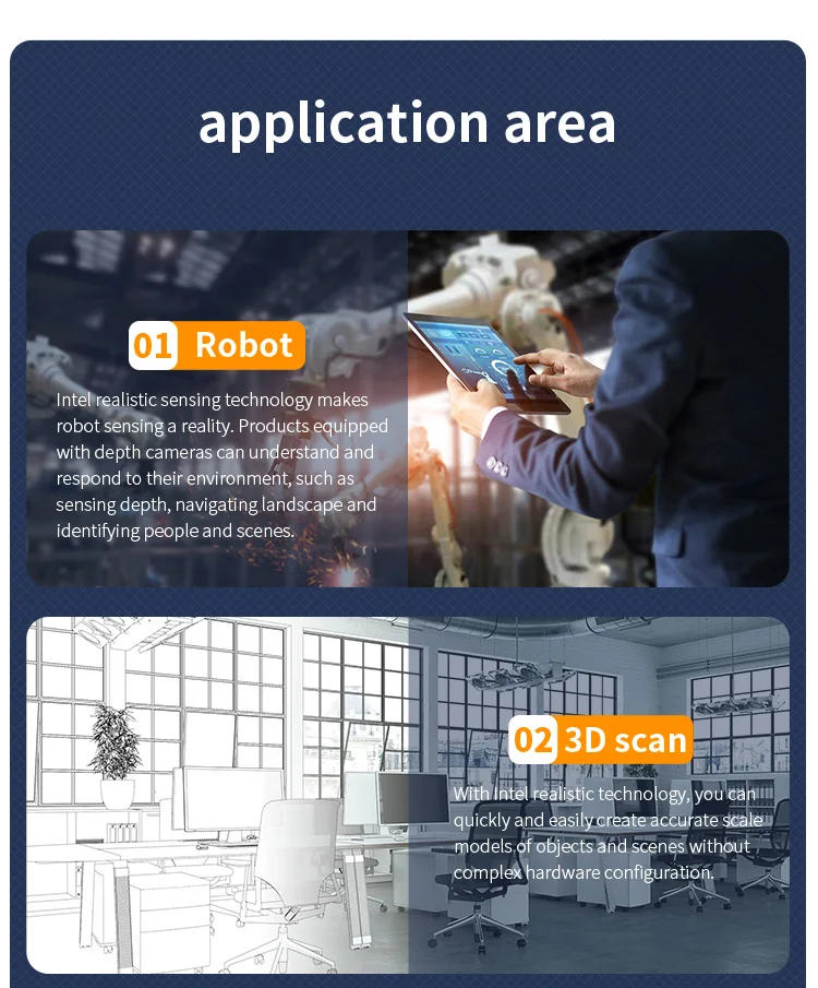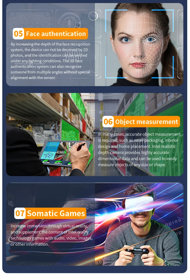 * Un rango más amplio puede evitar mejor colisiones. * Integre firmemente el sensor RGB y el sensor de profundidad para lograr un escaneo de mayor calidad. * El rango de profundidad es más amplio para lograr una pantalla sin contacto. * Configure fácilmente varias cámaras para crear mucho contenido.