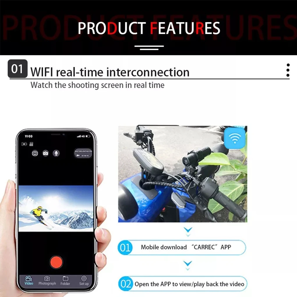 Recargable: la Cámara de la motocicleta está construida con una batería recargable, conveniente para que los usuarios la usen en cualquier lugar y en cualquier momento.