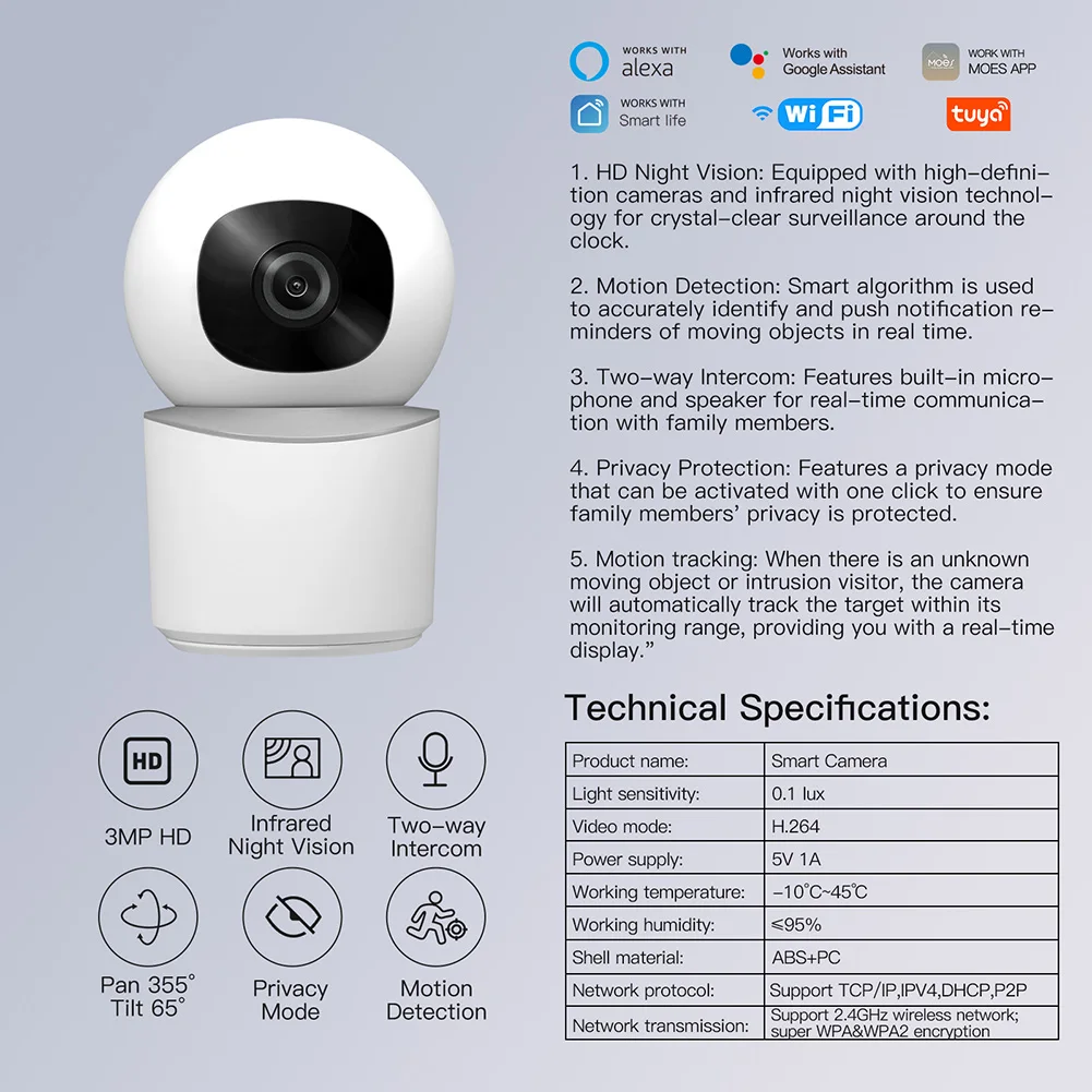 1. Cobertura de giro/inclinación de 360 °:La cámara de seguridad inteligente de panorámica/inclinación para interiores ofrece una lente de alta resolución de 3MP con una vista panorámica de 360 grados, lo que garantiza que no haya puntos ciegos. La visión nocturna infrarroja mejorada de 10 metros ofrece imágenes claras incluso en la oscuridad. Se pueden mostrar múltiples vistas de cámara simultáneamente, y admite Almacenamiento de tarjeta TF (no incluido) y almacenamiento en la nube para una grabación segura. Se puede colocar sobre una mesa, montado en la pared o montado en el techo para adaptarse a diversas aplicaciones.