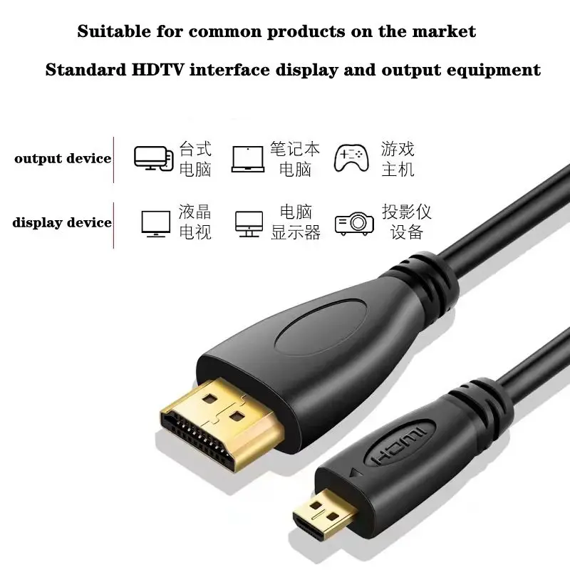 Aplicable: Se utiliza para conectar dispositivos de interfaz Micro HDMI con dispositivos de interfaz HDMI estándar, transmitiendo sincrónicamente señales de audio y video a dispositivos de visualización, tabletas, cámaras digitales y otros dispositivos que admitan interfaz Micro HDMI para transmisión de señales de audio y video.