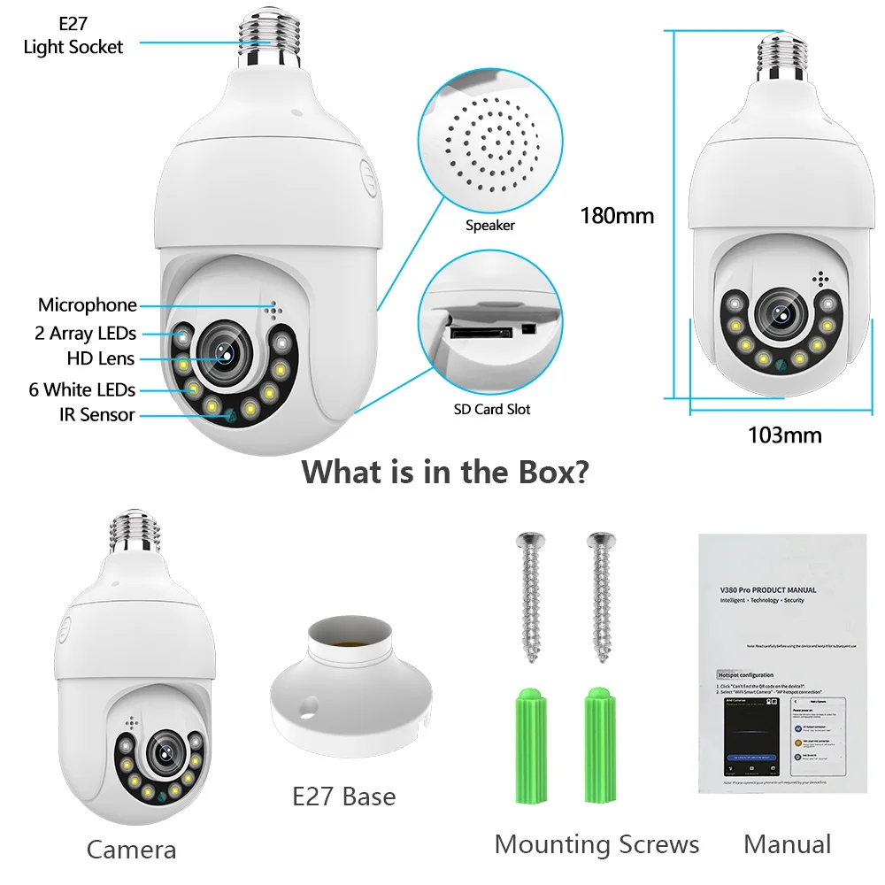 Descripción:Características principales* Grabación de vídeo con resolución Full HD de 3MP;* Admite seguimiento automático;* Admite almacenamiento máximo en tarjeta SD de 128G;* Admite detección de movimiento.* Admite giro/inclinación, gira 270 grados hacia la izquierda y hacia la derecha y gira 90 grados verticalmente.* Admite audio bidireccional, puedes escuchar y hablar con otro lado.* Admite visión nocturna en color, 4 LED blancos + 4 LED infrarrojos.* Admite visión nocturna ultratransparente de 20 m.Lista de paquetes1 * cámara con bombilla1 * Base E271 * Manual1 * bolsa de tornillosConsejos cálidos: la tarjeta SD es opcional.
