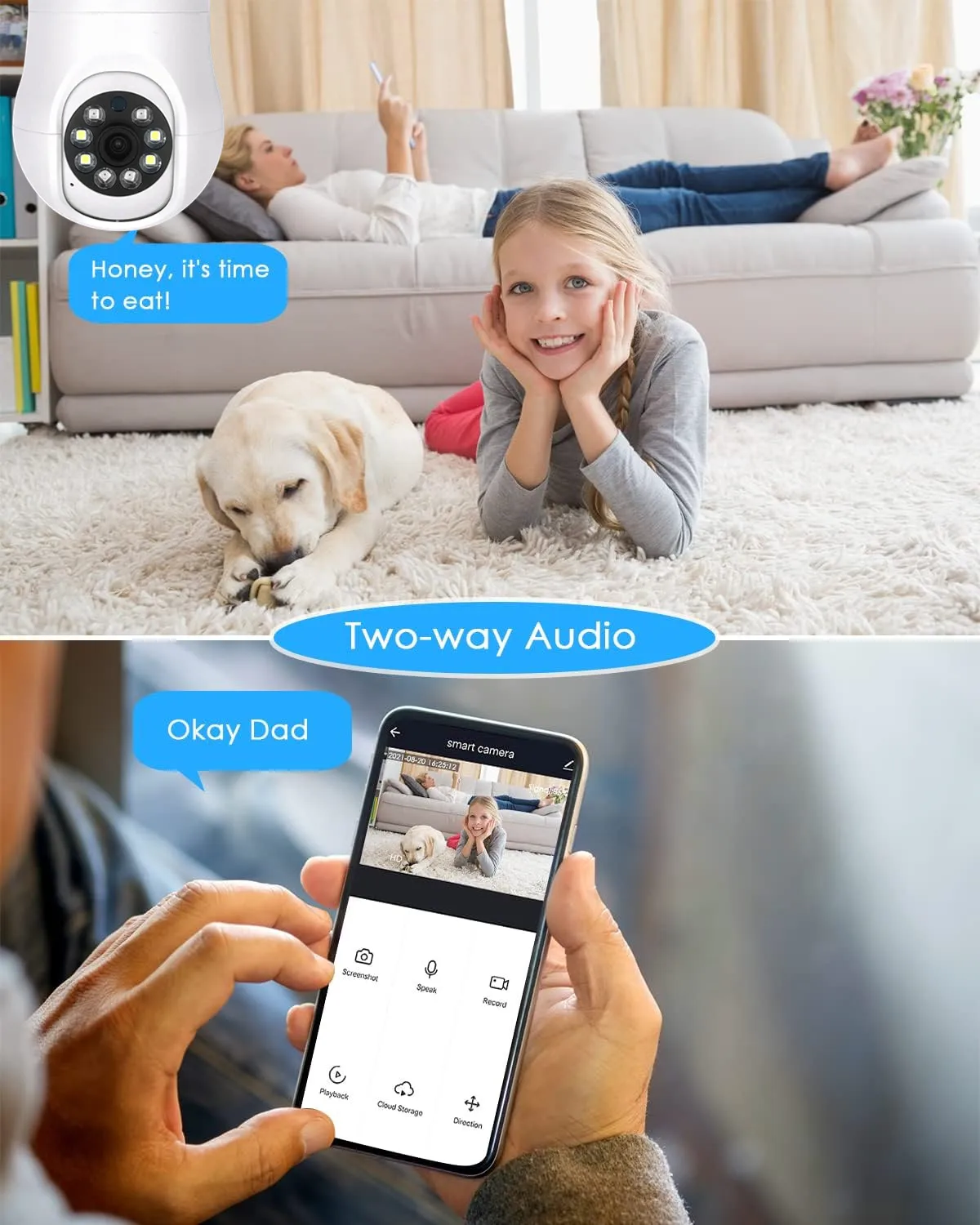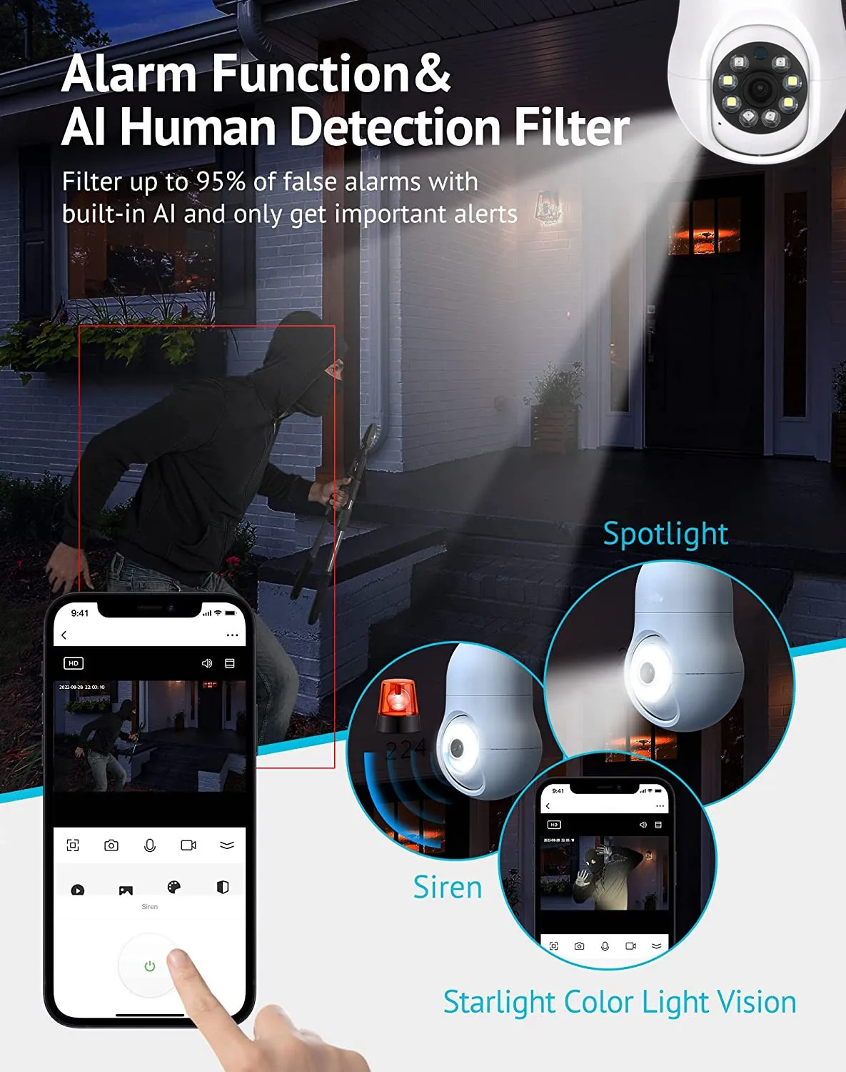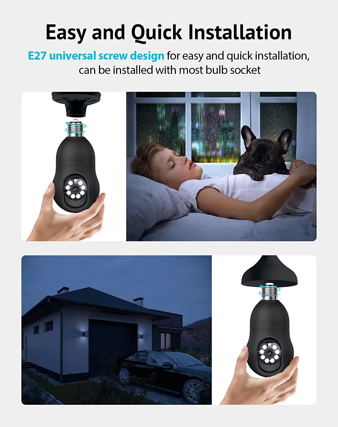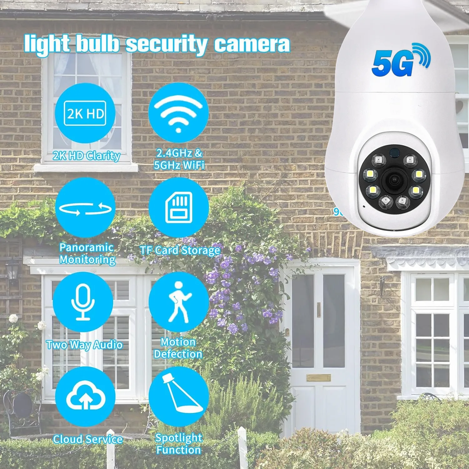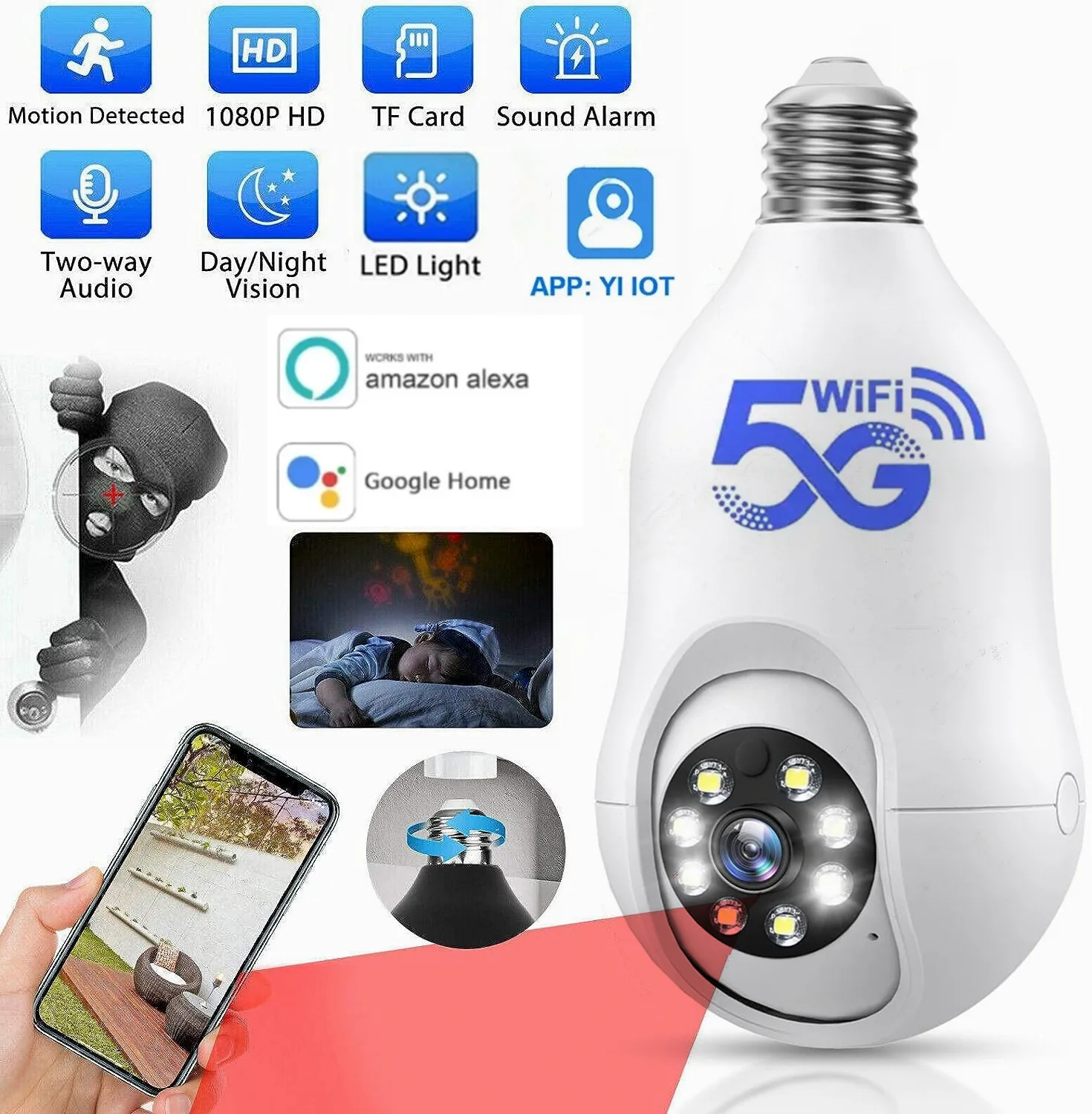 Descripción:Smart 2,4G WiFi E27 Bombilla Cámara Smart Home Security Video Vigilancia Supprt Audio bidireccional Movimiento móvilNota: Al agregar un dispositivo, asegúrese de que el Wi-Fi esté disponible y conectado a Internet.* Se puede utilizar como bombilla* Pantalla de imagen HD* Soporte de sincronización de detección de sonido de detección de movimiento* La habitación interior aplicable se puede izar con la base de la bombilla* APP: vida inteligente* Código de escaneo del dispositivo para agregar, enlace de punto de acceso AP;* Admite modo infrarrojo único, modo a todo color único, modo de luz dual inteligente.* Admite monitoreo de voz, intercomunicador, detección de movimiento, alarma de detección de sonido;* Admite almacenamiento de vídeo en la nube, admite Almacenamiento de tarjeta TF de 8-128G; (La tarjeta de memoria TF no está incluida en el alcance de la entrega)* Admite el monitoreo remoto de varios teléfonos móviles (IOS, Android);* Pantalla de píxeles de alta definición de 2MP, la imagen es clara y delicada;* Fuente de alimentación: DC 5V1.5 A, cable de alimentación de interfaz;* Temperatura de trabajo: -10 ℃-+ 40 ℃;