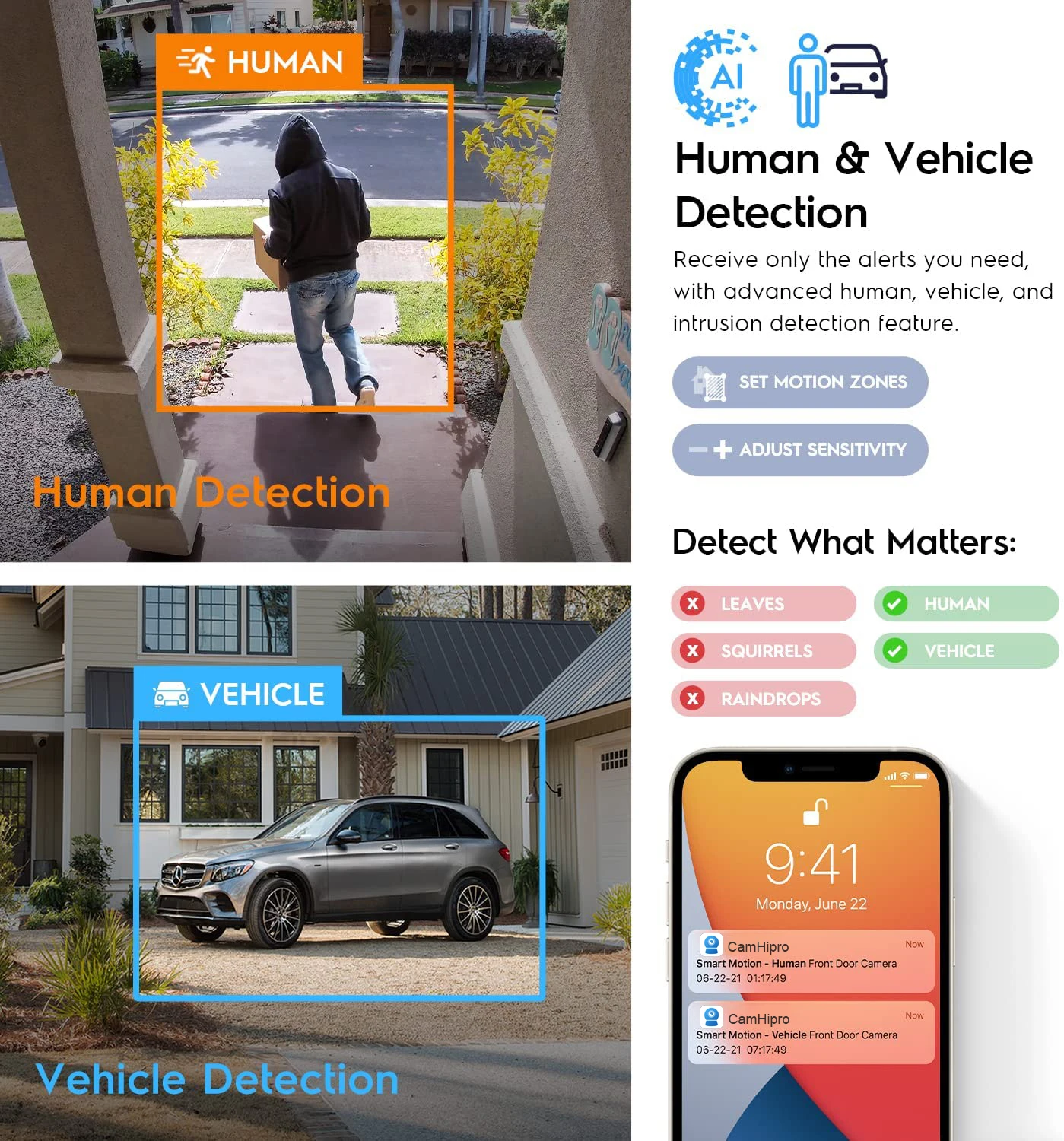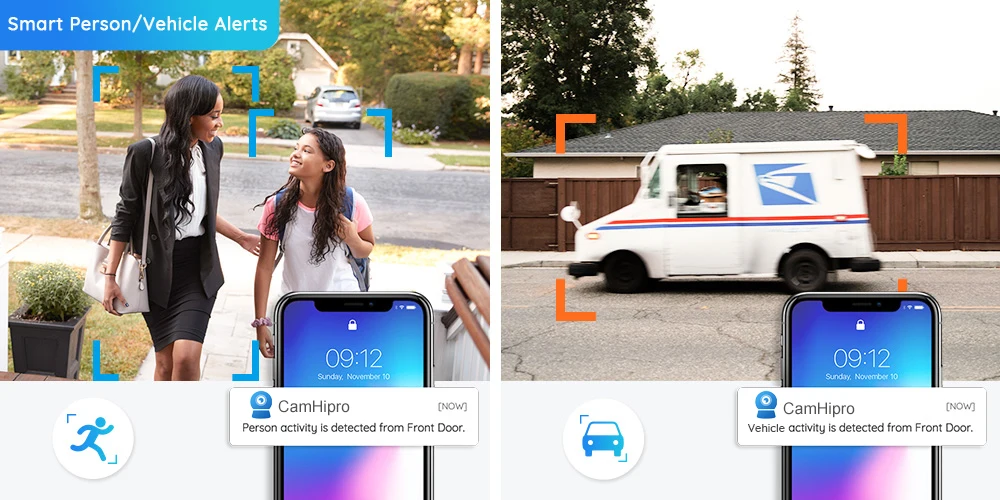 Alimentada por tecnología inteligente de detección de movimiento, esta Cámara puede distinguir a personas y vehículos de otros objetos. Reciba alertas cuando una persona o automóvil sospechoso esté merodeando por su casa o tienda. Proteja su propiedad de posibles amenazas.