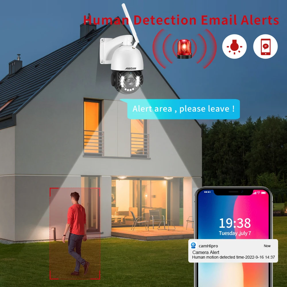 La cámara ajustará la rotación de giro/inclinación y el zoom automáticamente, capturando objetivos de monitoreo claros y rastreando automáticamente a personas en movimiento, y enviando alertas por correo electrónico o notificaciones a su teléfono.