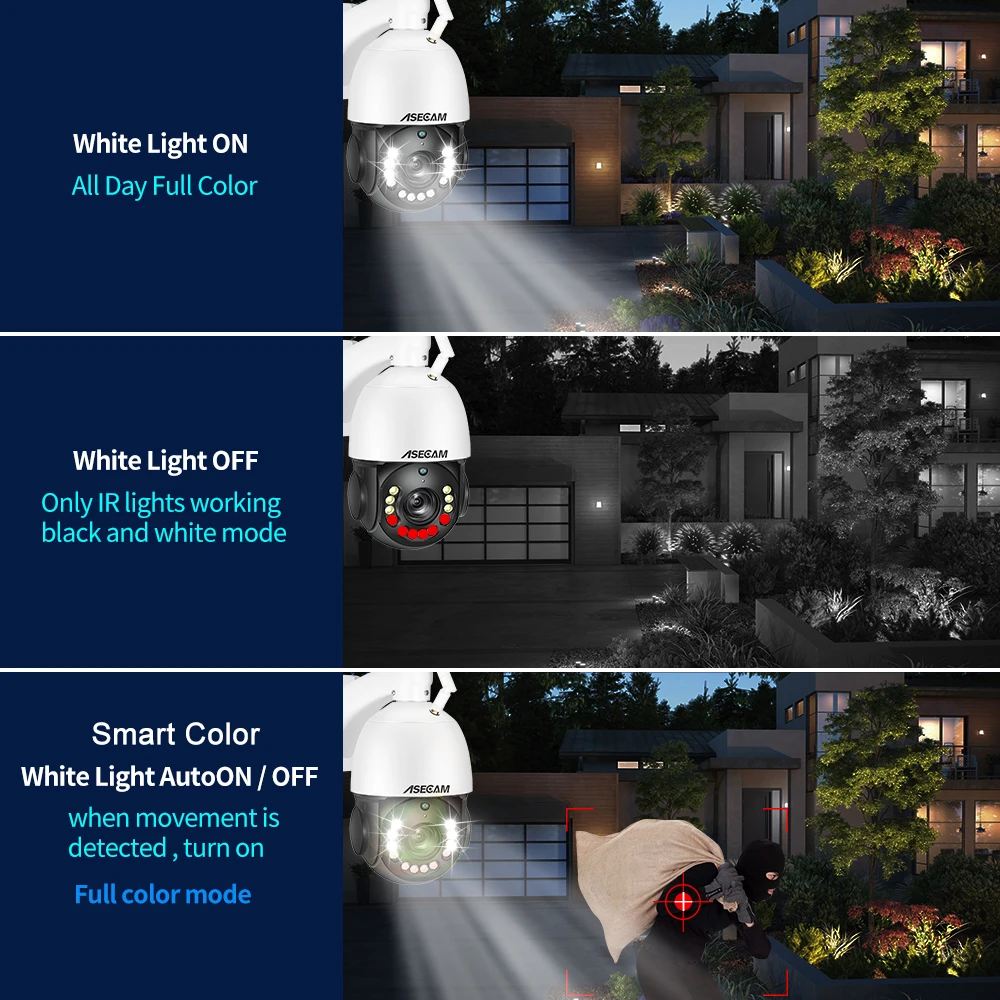 Cuando los 6 LED blancos se iluminan, la cámara mostrará una visión colorida por la noche, hay tres modos nocturnos para que selecciones. Visión diurna, visión nocturna, visión nocturna a todo color. Tres modos nocturnos para que selecciones. Esta Cámara PTZ tiene un increíble rango de visión nocturna IR de hasta 330 pies (100m) en total oscuridad. Además, agregar iluminación adicional alrededor de la Cámara activará automáticamente nuestra revolucionaria tecnología de visión nocturna a color (CNV). Esta importante característica agregará un nivel adicional de información visual que puede ayudar a identificar personas u objetos y aumentar el contraste para facilitar la detección y el reconocimiento.