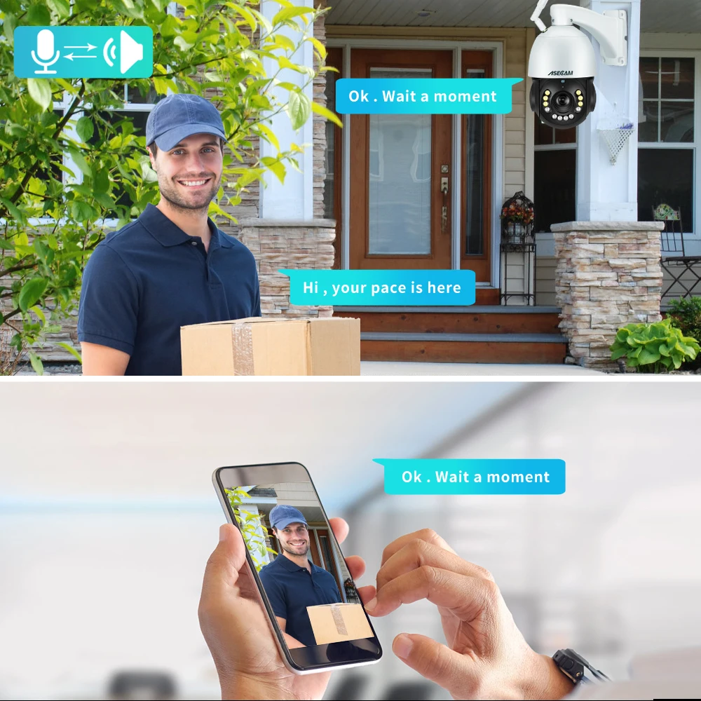 El reflector se puede configurar para encenderse cuando se detectan objetos en movimiento en la oscuridad, también puede configurar la alarma sonora para hacer una sirena fuerte cuando se detecta el objeto en movimiento. El micrófono y el altavoz avanzados incorporados le permiten ahuyentar a los invitados no invitados, enviar comandos a las mascotas, saludar para dar la bienvenida a los invitados.