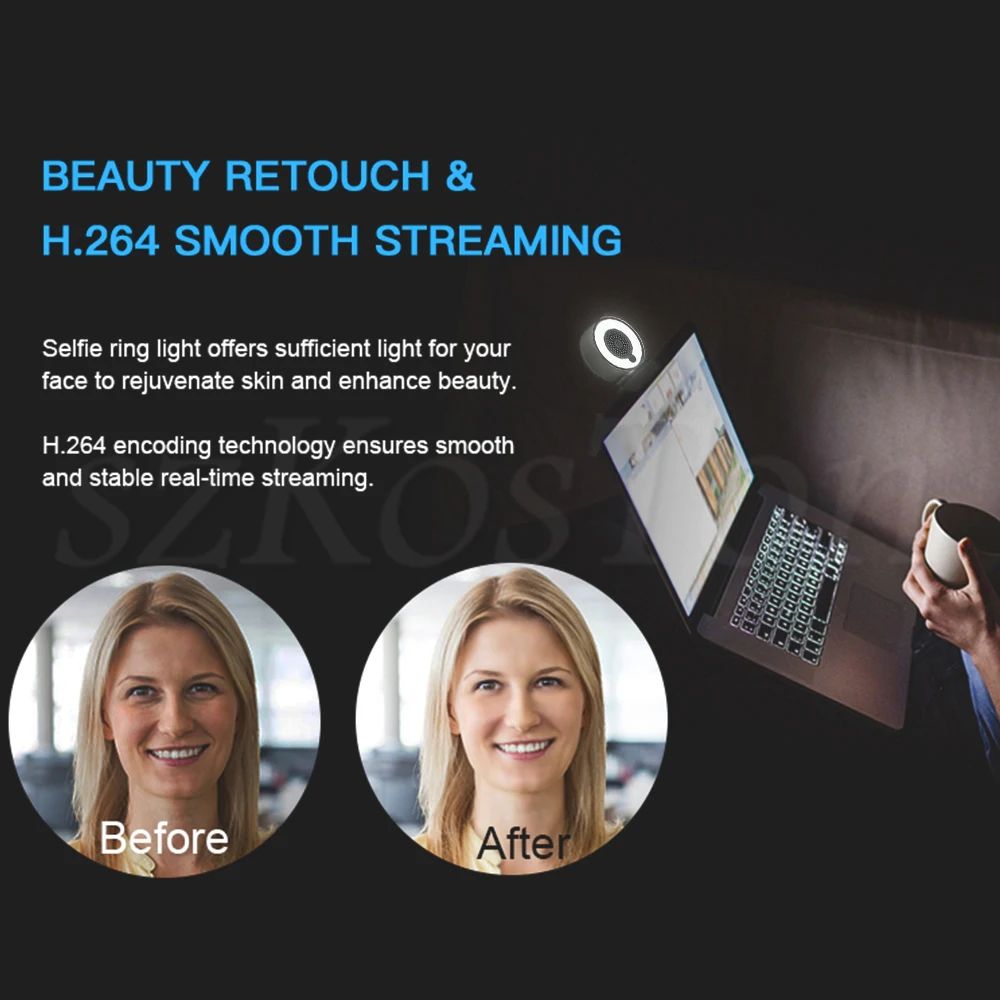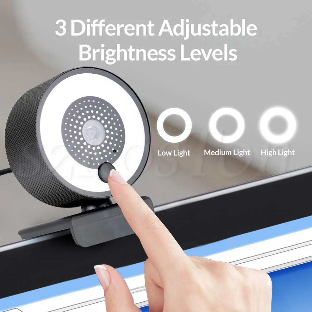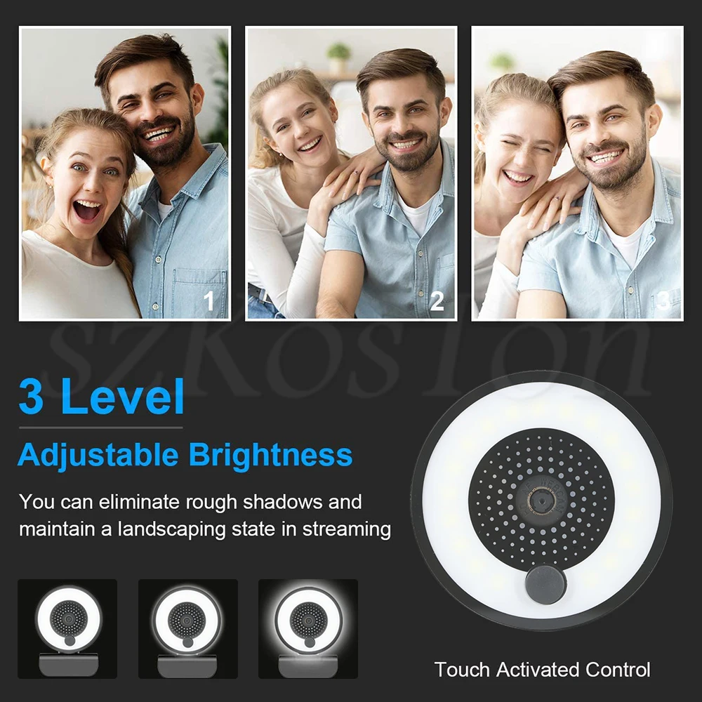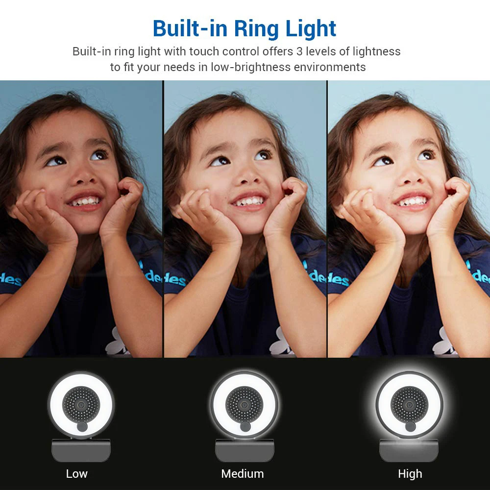 1.) Anillo de luz ajustable de 3 niveles: la cómoda luz blanca con control táctil le permite cambiar rápidamente el nivel de brillo con poca iluminación sin necesidad de entrar en la configuración del software. La mejora facial y la tecnología de lentes de alta definición hacen que su video chat sea más seguro.