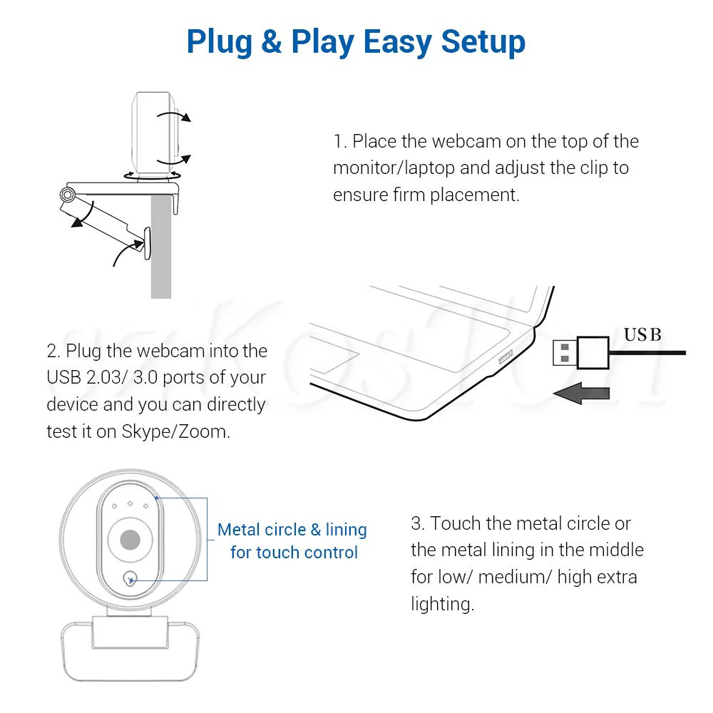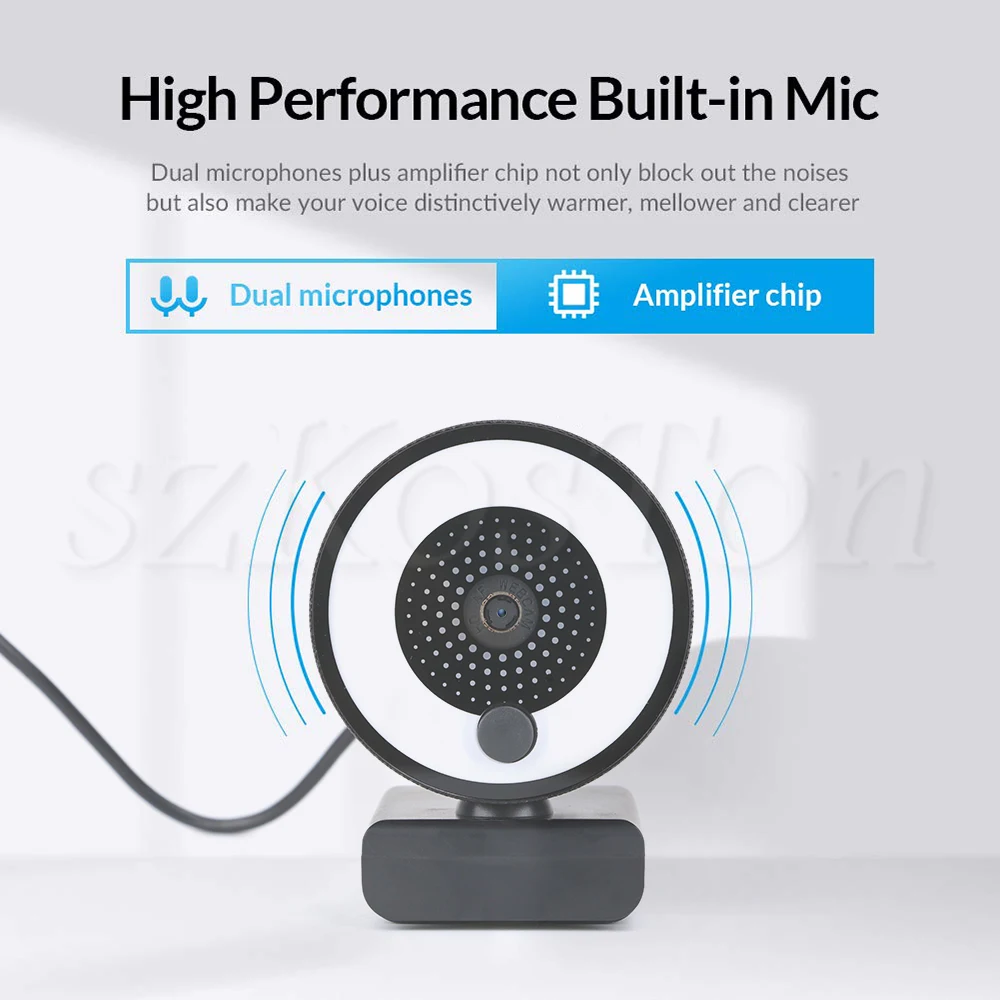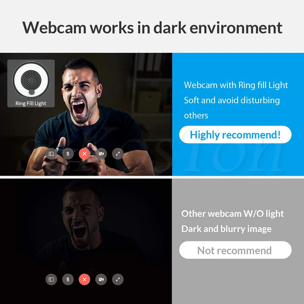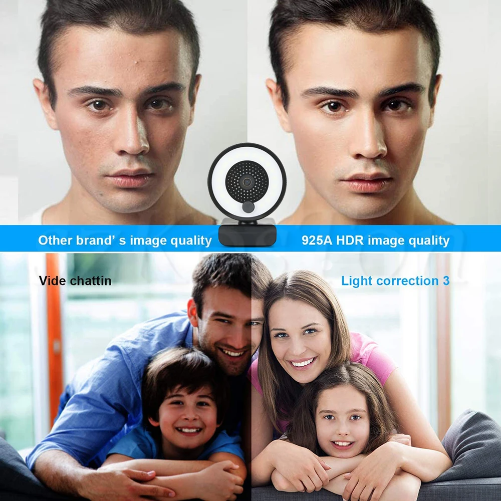 1.) Anillo de luz ajustable de 3 niveles: la cómoda luz blanca con control táctil le permite cambiar rápidamente el nivel de brillo con poca iluminación sin necesidad de entrar en la configuración del software. La mejora facial y la tecnología de lentes de alta definición hacen que su video chat sea más seguro.