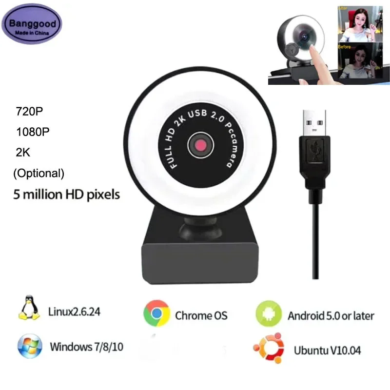 Comprar Cámara web HD 720P/1080P/2K para ordenador, PC, 5 millones de píxeles, videollamada, cámara web con micrófono de reducción de ruido, luz embellecedora