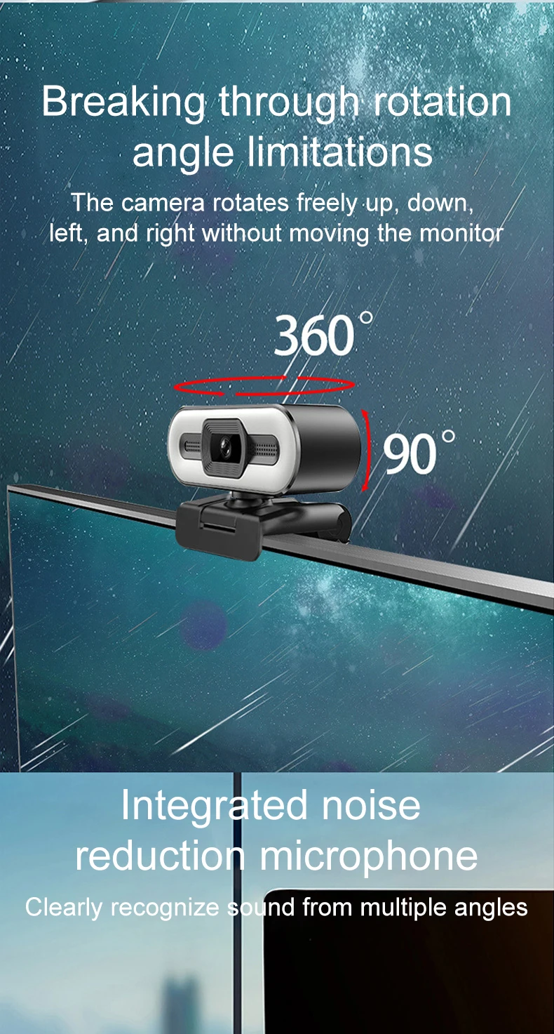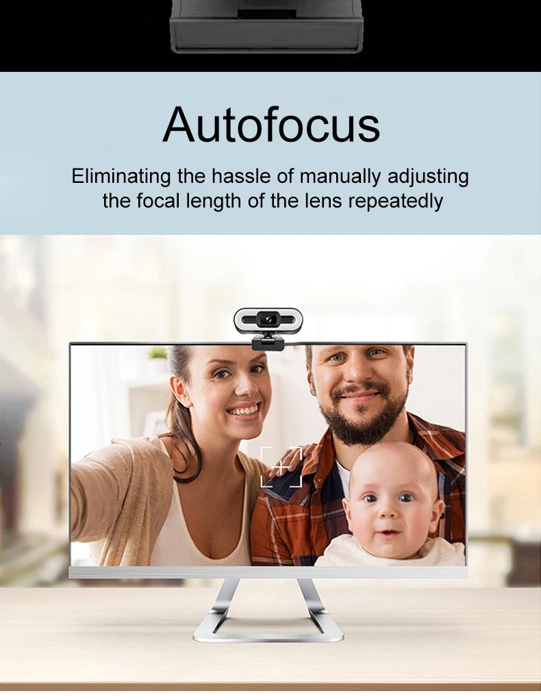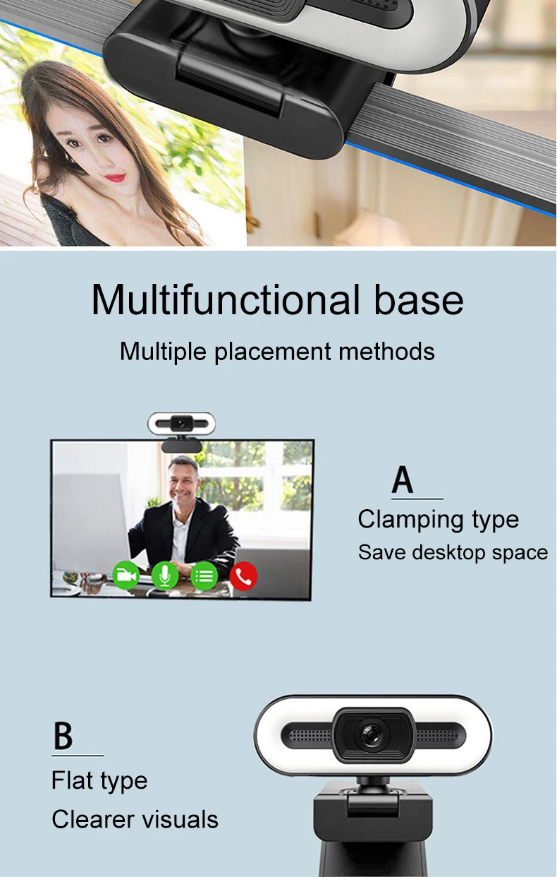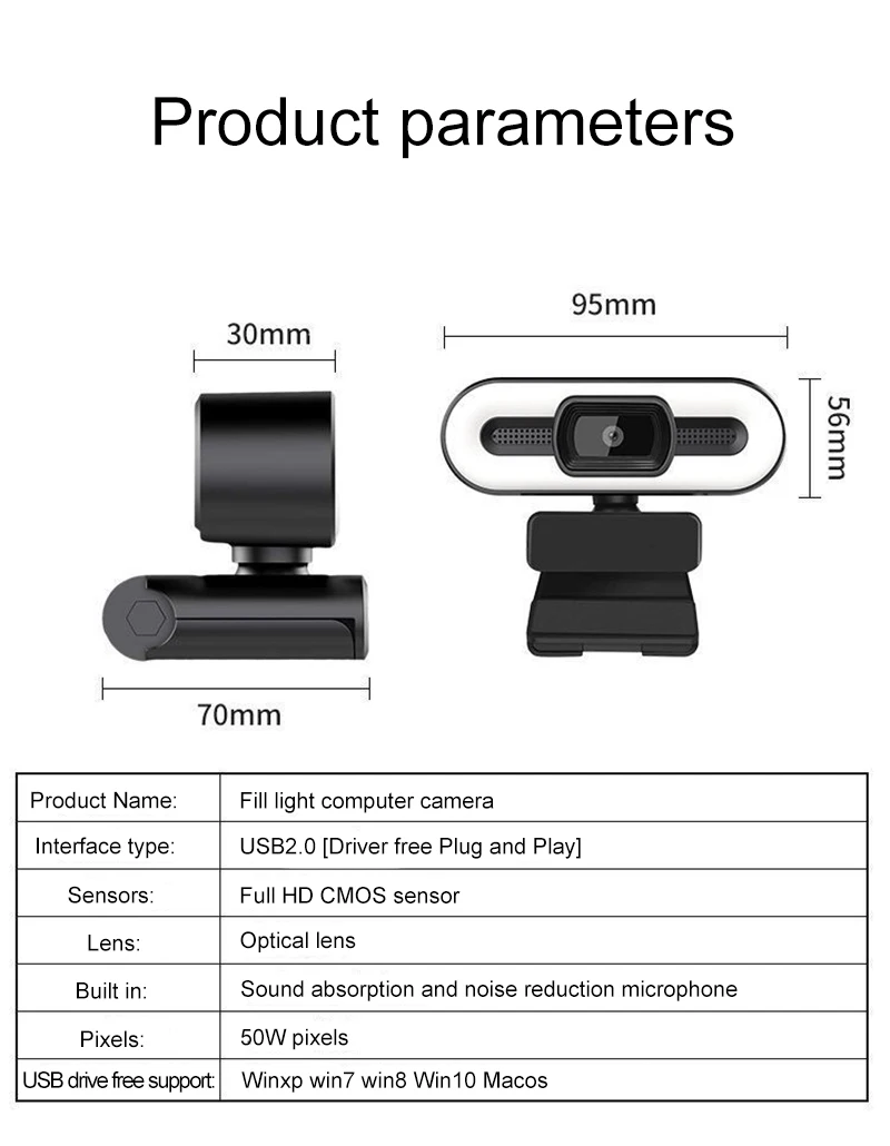 Especificación del producto:Tipo de artículo: Cámara web con luz de rellenoUso: Escritorio, computadora portátil, PC, etc.Tipo de sensor: CMOSPíxeles del sensor: 2 / 5 /6/ 8 millonesResolución máxima: 1920*1080,2560*1440,3264*1836,3840*2160Interfaz: USB 2.0/3,0Necesidad de conducir: unidad libreMaterial: ABSSistema de soporte: Para Windows XP2 o superior, MAC, Vista, Win7/8/10 y otros sistemas operativosAdmite eliminación 3D, mejora de imagen y función de procesamiento de mejora de contraste dinámicoCaracterística:1. Cámara sin unidad de alta definición, plug and play, conveniente y rápida, adiós a la falta de claridad.2.No es necesario instalar controladores ni software; simplemente conecte esta cámara al puerto USB del dispositivo.3. Micrófono incorporado, sin instalación, sin controlador, plug and play. Sonido integrado de una sola línea USB.4,2/3 millones de píxeles, alta resolución 2K, unidad libre HD.5. Adecuado tanto para cerca como para lejos, 360° Base giratoria, cámara Full HD.6.Con la ayuda del micrófono incorporado, al tiempo que reduce el ruido de fondo, le proporciona la conversación más clara y completa al realizar una videollamada o transmitir video.7.Especialmente diseñado para videoconferencias profesionales mientras trabaja en casa, así como videos sociales, videos de juegos, imágenes fluidas para reuniones de Skype, videollamadas, etc.Lista de paquetes:1 * Wbecam1 * Manual de usuario