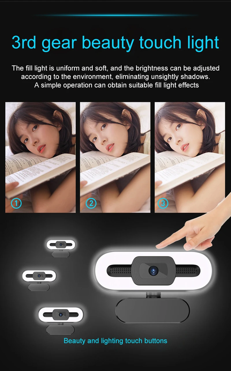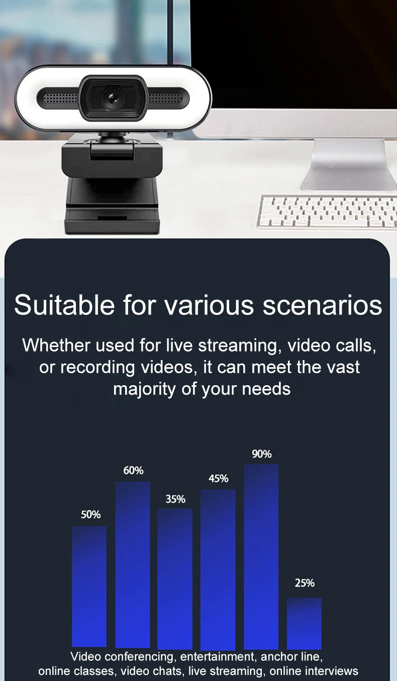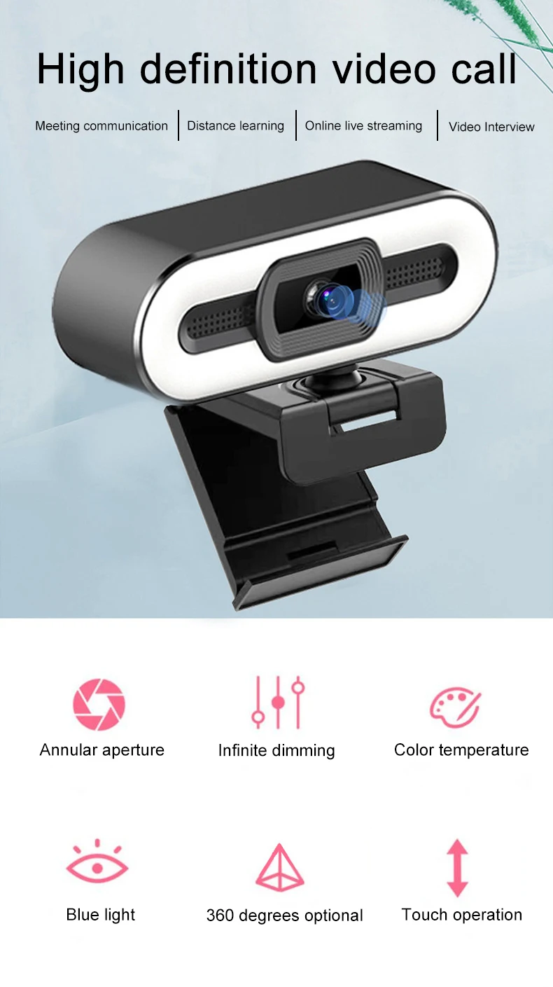 Especificación del producto:Tipo de artículo: Cámara web con luz de rellenoUso: Escritorio, computadora portátil, PC, etc.Tipo de sensor: CMOSPíxeles del sensor: 2 / 5 /6/ 8 millonesResolución máxima: 1920*1080,2560*1440,3264*1836,3840*2160Interfaz: USB 2.0/3,0Necesidad de conducir: unidad libreMaterial: ABSSistema de soporte: Para Windows XP2 o superior, MAC, Vista, Win7/8/10 y otros sistemas operativosAdmite eliminación 3D, mejora de imagen y función de procesamiento de mejora de contraste dinámicoCaracterística:1. Cámara sin unidad de alta definición, plug and play, conveniente y rápida, adiós a la falta de claridad.2.No es necesario instalar controladores ni software; simplemente conecte esta cámara al puerto USB del dispositivo.3. Micrófono incorporado, sin instalación, sin controlador, plug and play. Sonido integrado de una sola línea USB.4,2/3 millones de píxeles, alta resolución 2K, unidad libre HD.5. Adecuado tanto para cerca como para lejos, 360° Base giratoria, cámara Full HD.6.Con la ayuda del micrófono incorporado, al tiempo que reduce el ruido de fondo, le proporciona la conversación más clara y completa al realizar una videollamada o transmitir video.7.Especialmente diseñado para videoconferencias profesionales mientras trabaja en casa, así como videos sociales, videos de juegos, imágenes fluidas para reuniones de Skype, videollamadas, etc.Lista de paquetes:1 * Wbecam1 * Manual de usuario