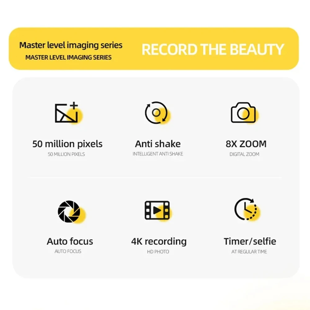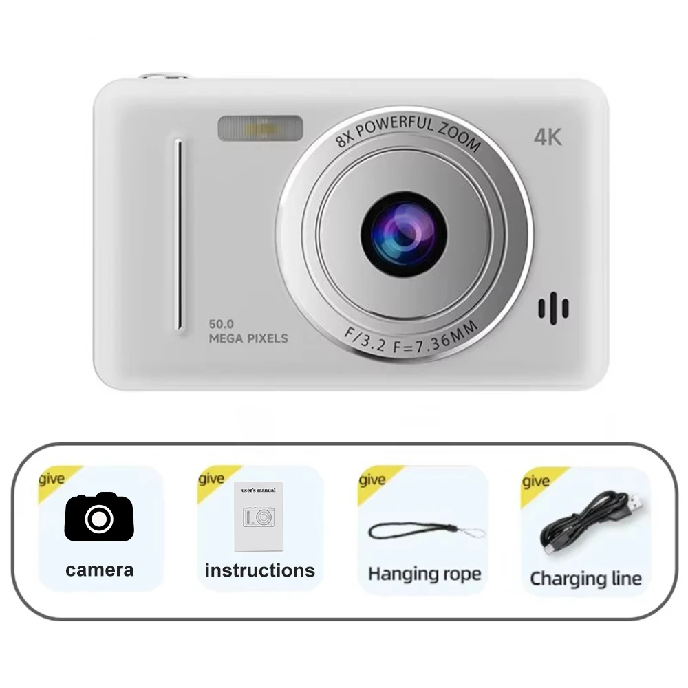 1.Cámara digital 4K 50MP: esta cámara digital se puede utilizar para producir vídeos con resolución Full HD 4K.La cámara digital de 50 MP está equipada con CMOS y una pantalla IPS en color verdadero de 2,4 pulgadas, que puede capturar fotografías claras y vívidas.