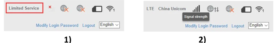 2. No se admite la frecuencia o la tarjeta SIM se realiza cuando se solicita "Sin servicio" o "Servicio limitado", como se muestra a continuación 1):3. Asegúrese de que la intensidad de la señal 3G/4G sea suficiente, como se muestra a continuación 2):