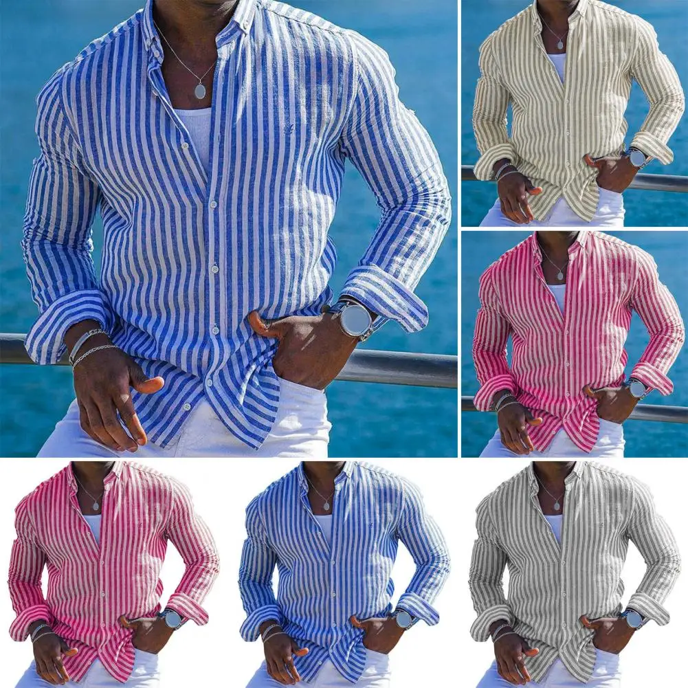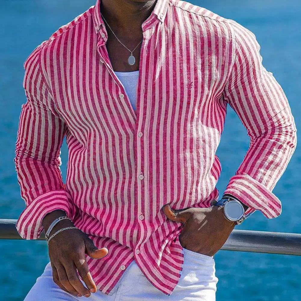 Camisa a rayas para hombre Camisa de vestir de Estilo Hawaiano ajustada para hombre con manga larga Diseño de un solo pecho para vacaciones Top de playa
