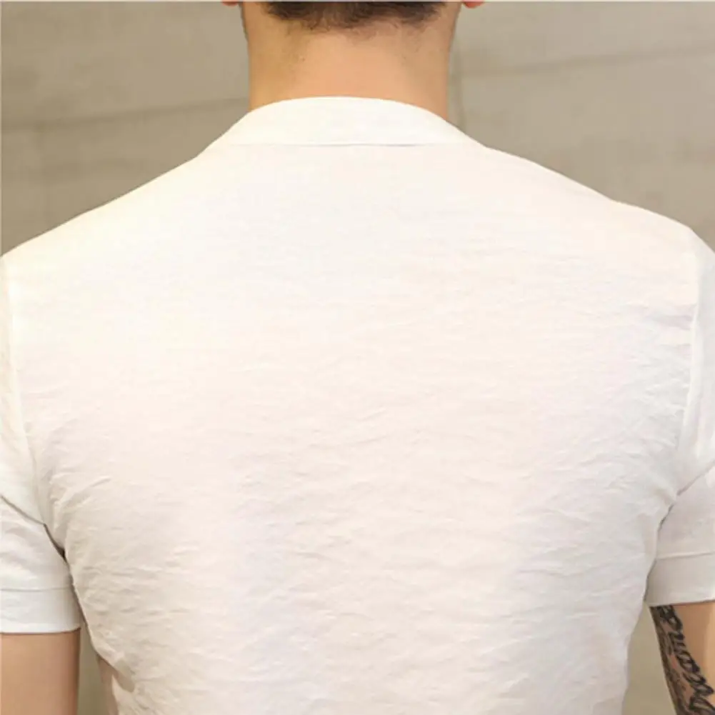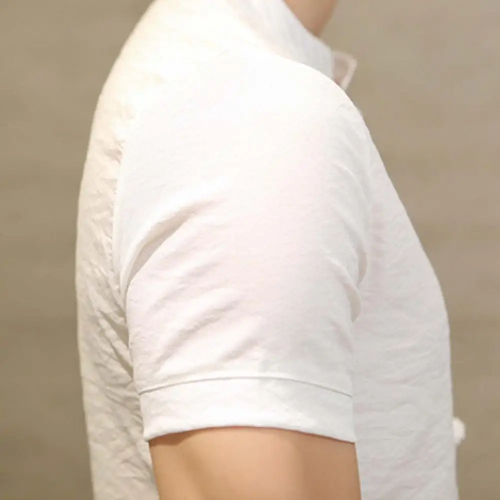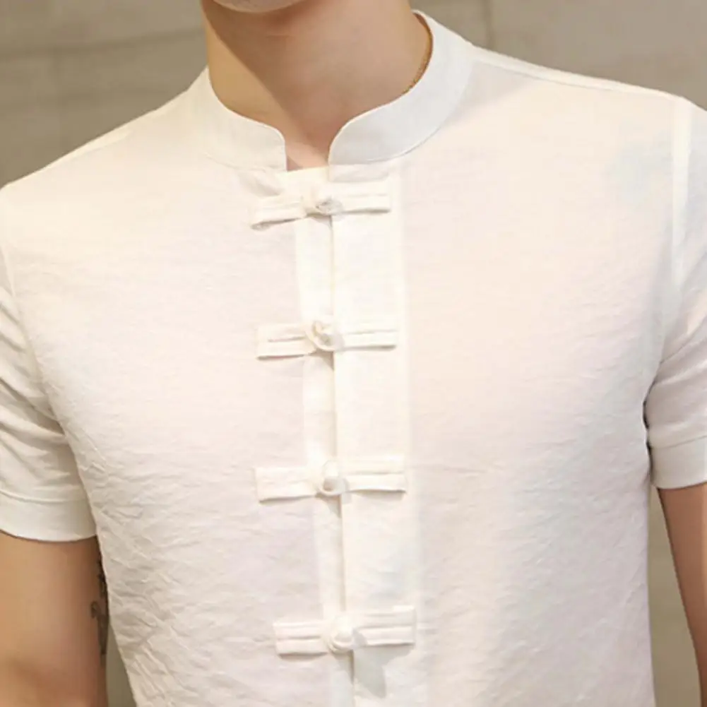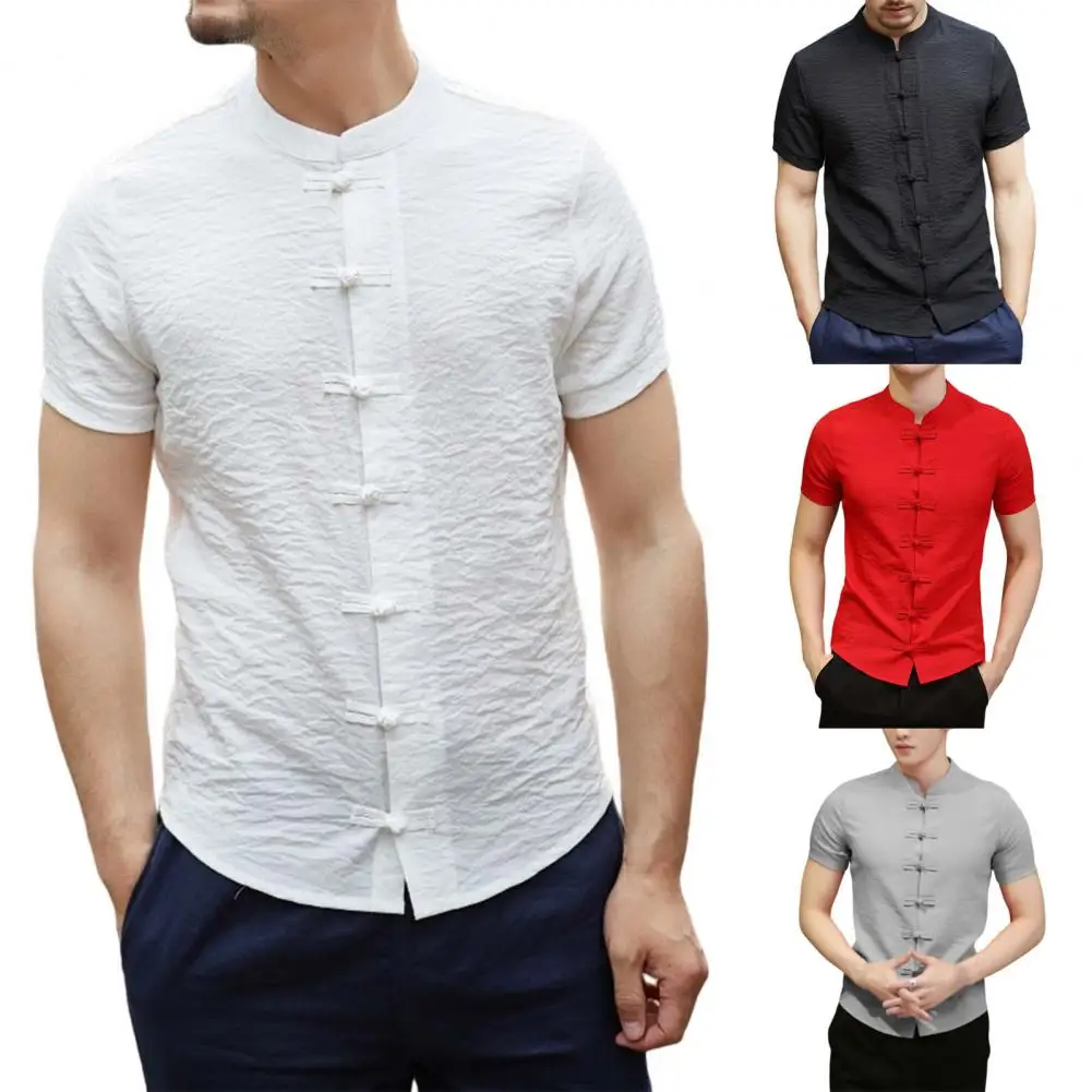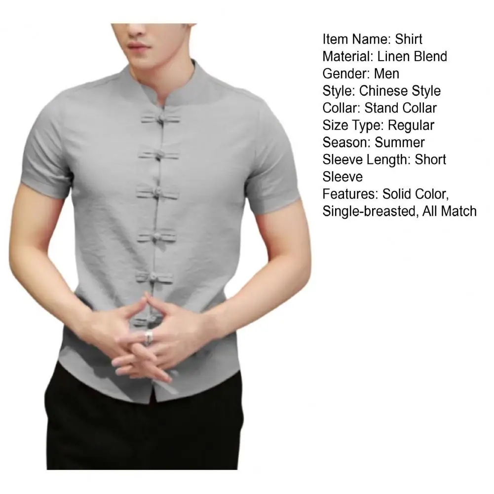 Género: Hombres Estilo: Estilo chino Collar: Cuello levantado Tipo de tamaño: Regular Temporada: Verano Longitud de La Manga: Manga corta Características: Color sólido, de un solo pecho, All Match