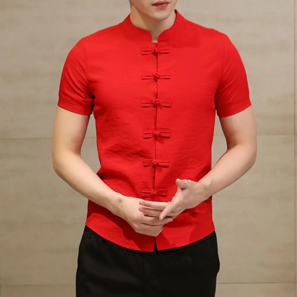 Género: Hombres Estilo: Estilo chino Collar: Cuello levantado Tipo de tamaño: Regular Temporada: Verano Longitud de La Manga: Manga corta Características: Color sólido, de un solo pecho, All Match