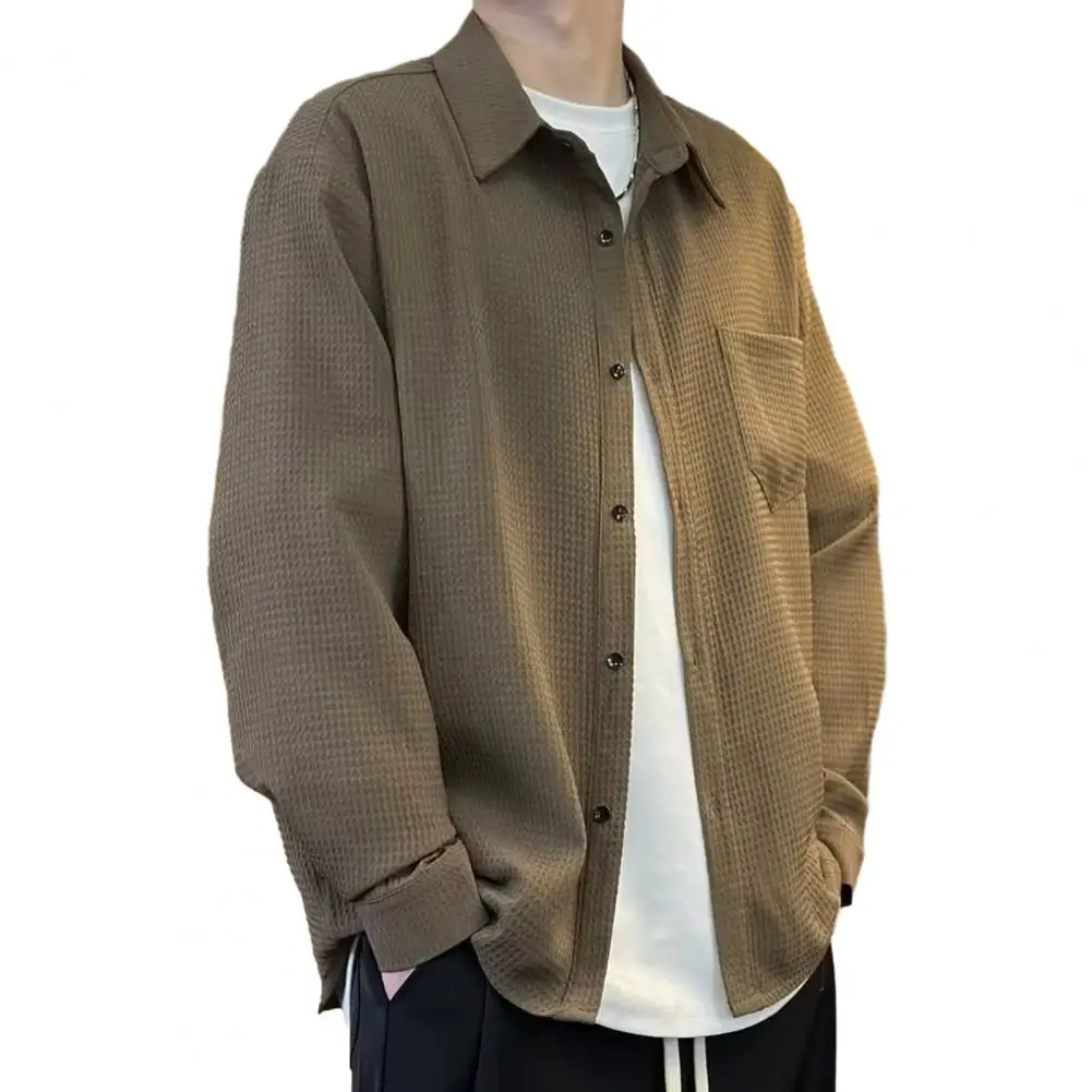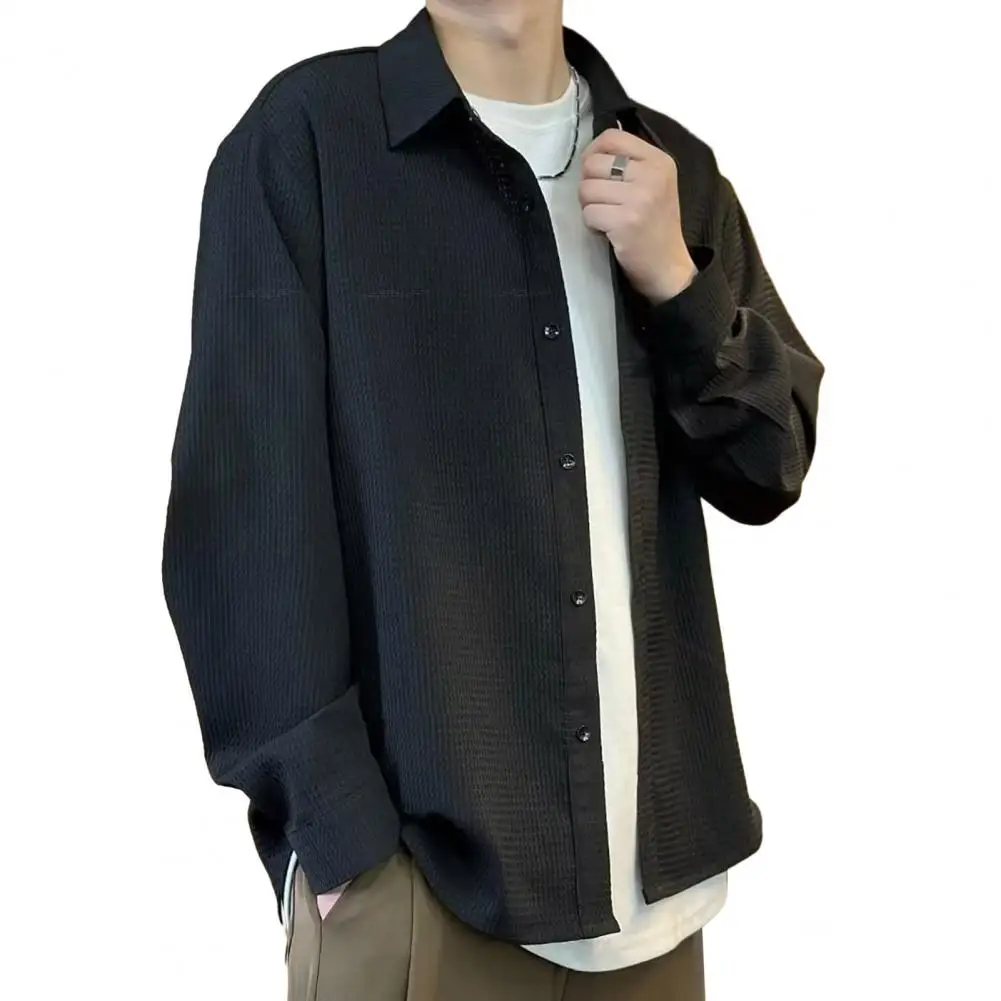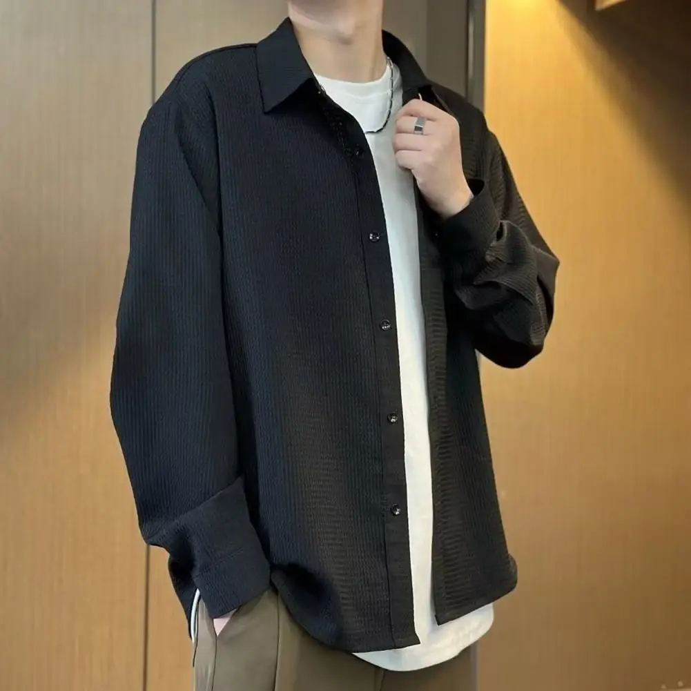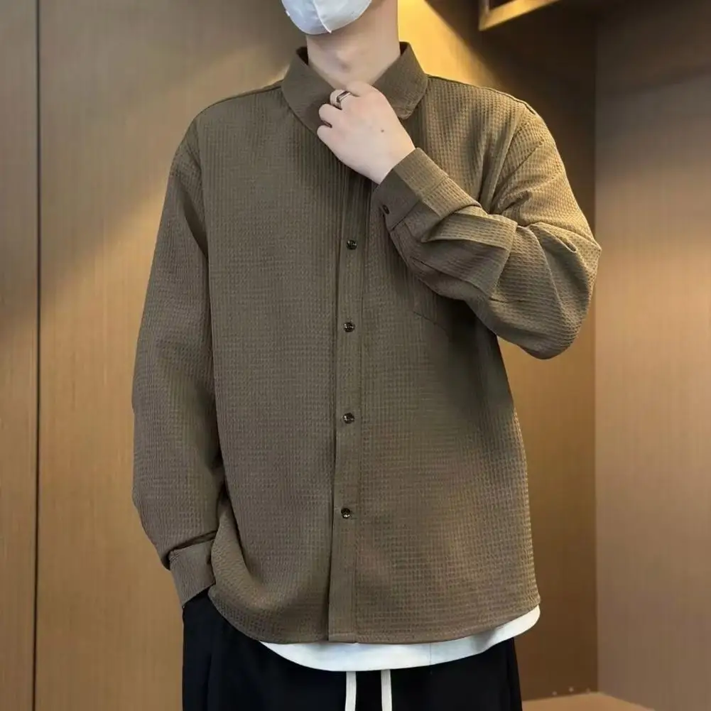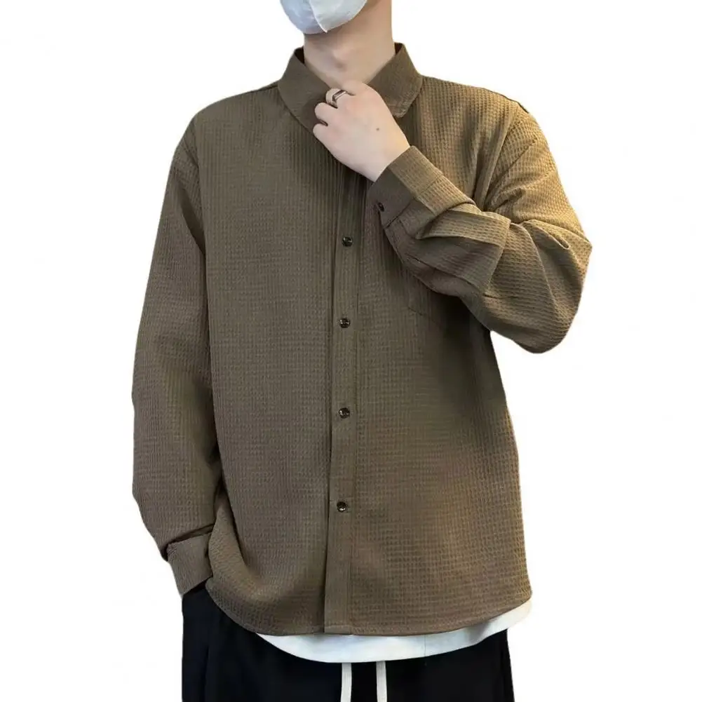 Camisa sencilla y elegante para hombre, cárdigan de otoño y primavera para hombre con cuello vuelto, manga larga, ajuste holgado, longitud media, sólido para jóvenes