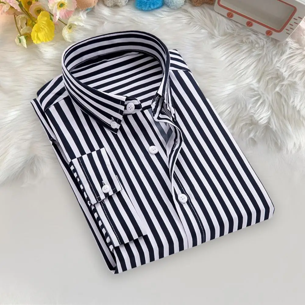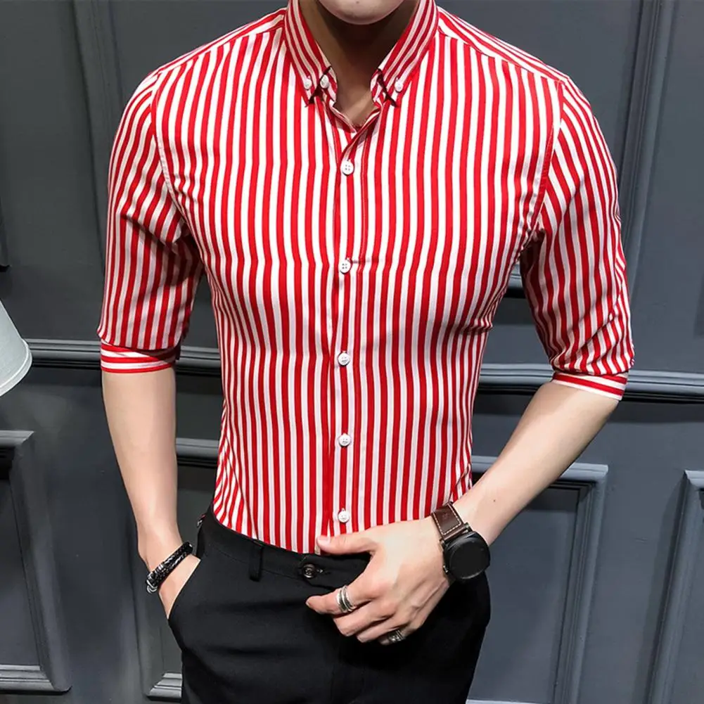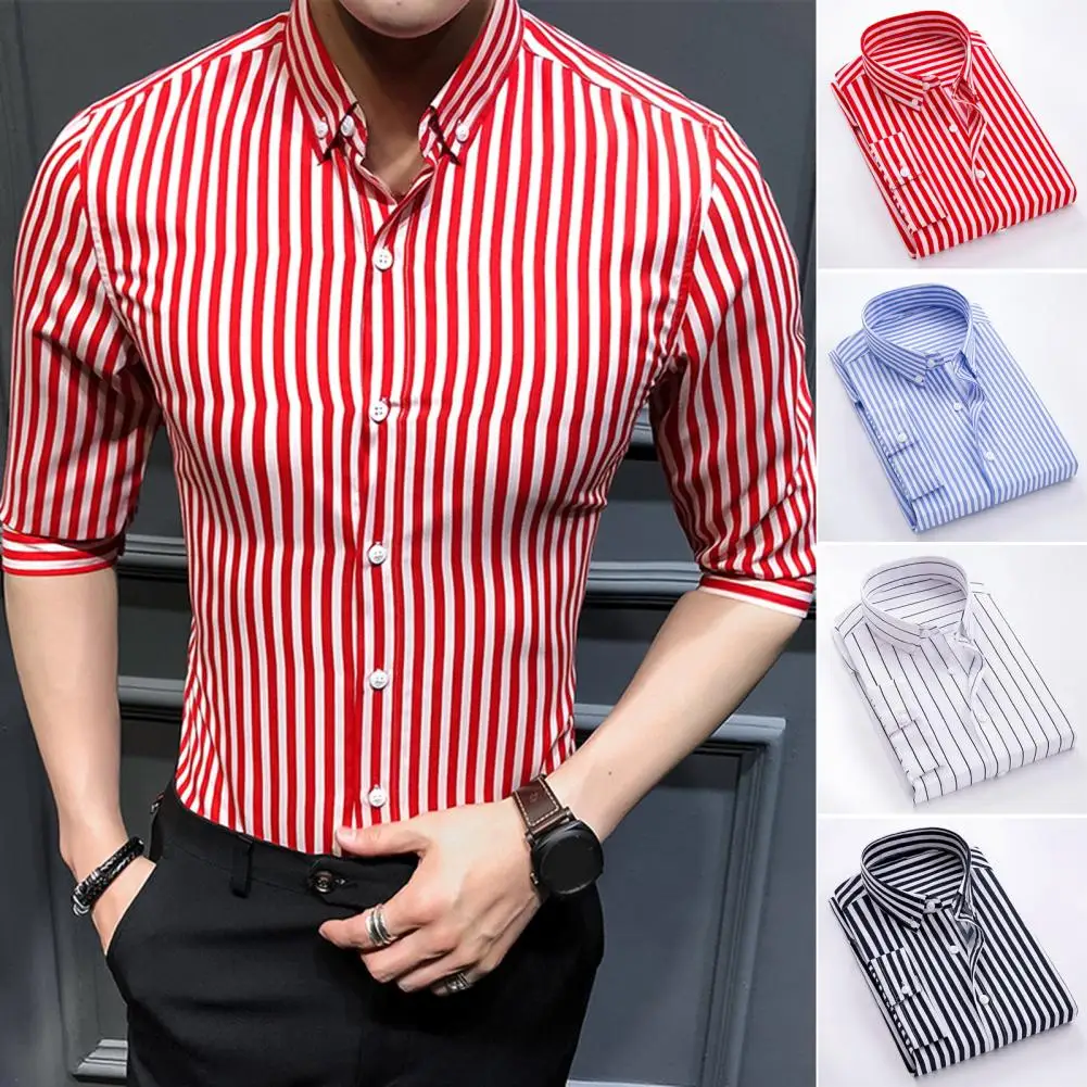 Camisa de oficina para hombre, camisa de negocios de manga tres cuartos a rayas para hombre, Top de oficina con solapa ajustada en estilo Formal suave de longitud media para hombre
