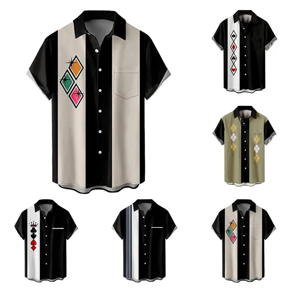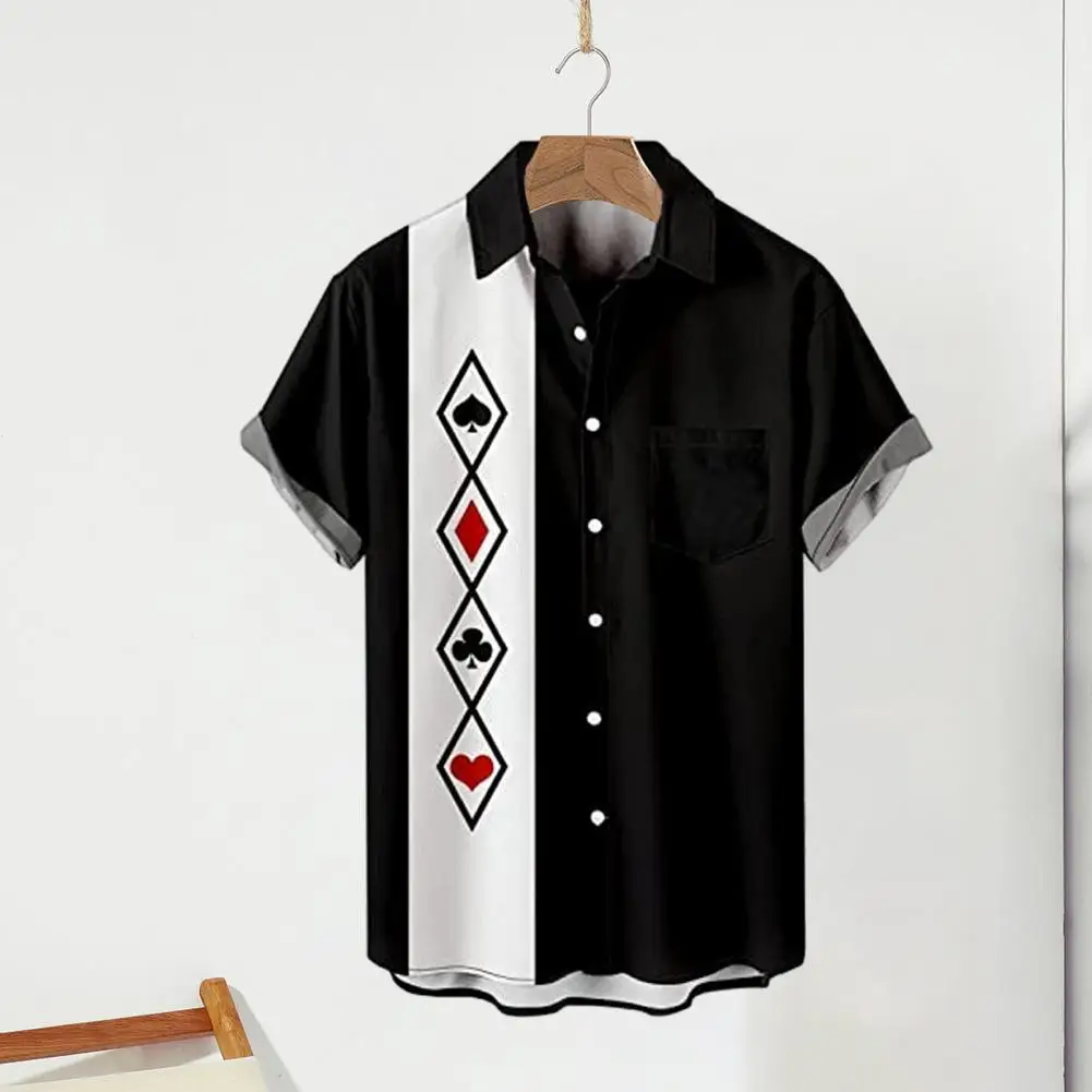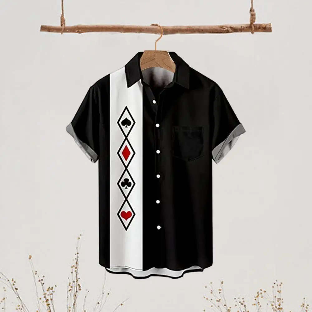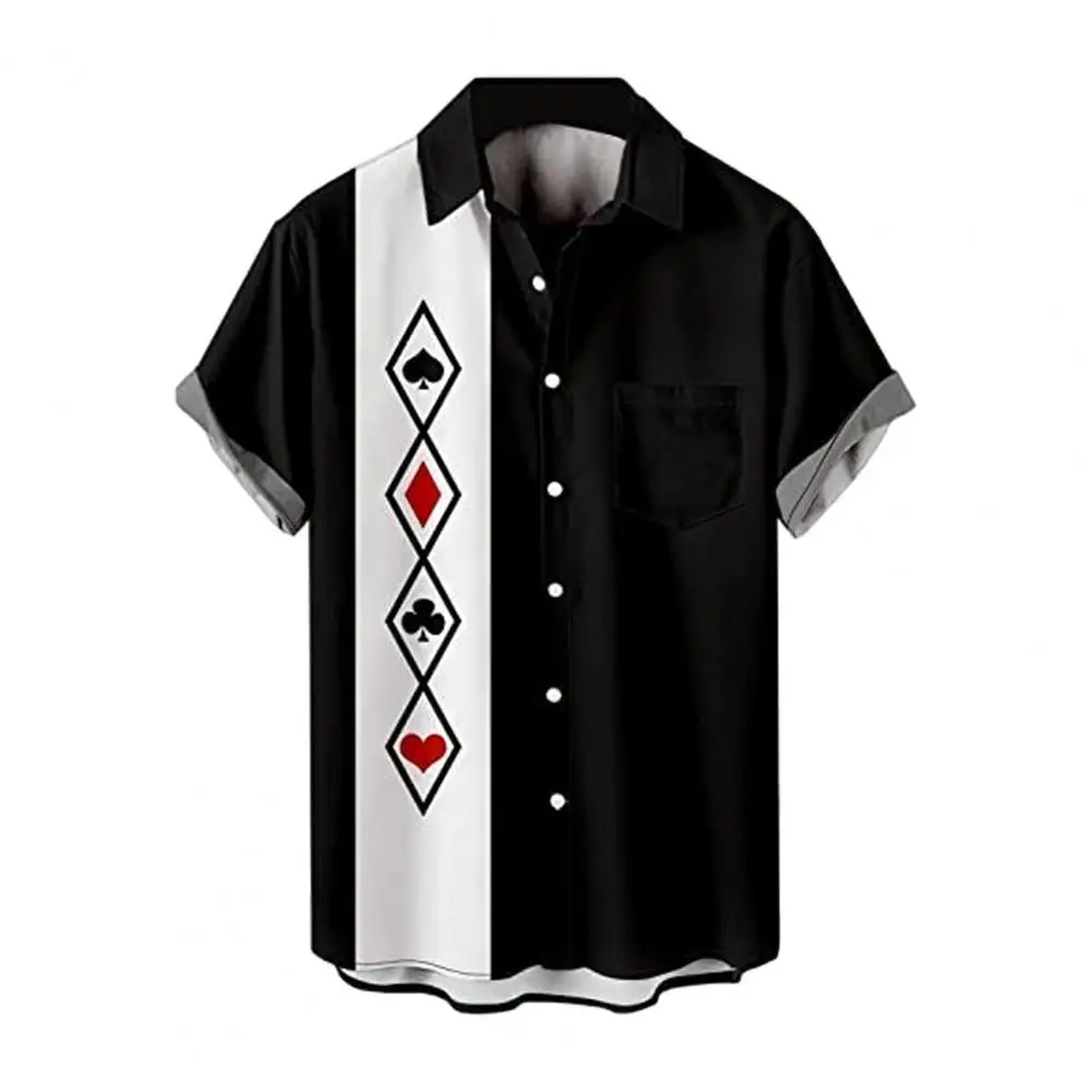 Top transpirable para hombre, camisa de verano con estampado de póker para hombre con bolsillo de parche de Color en contraste, Top informal transpirable para uso diario corto