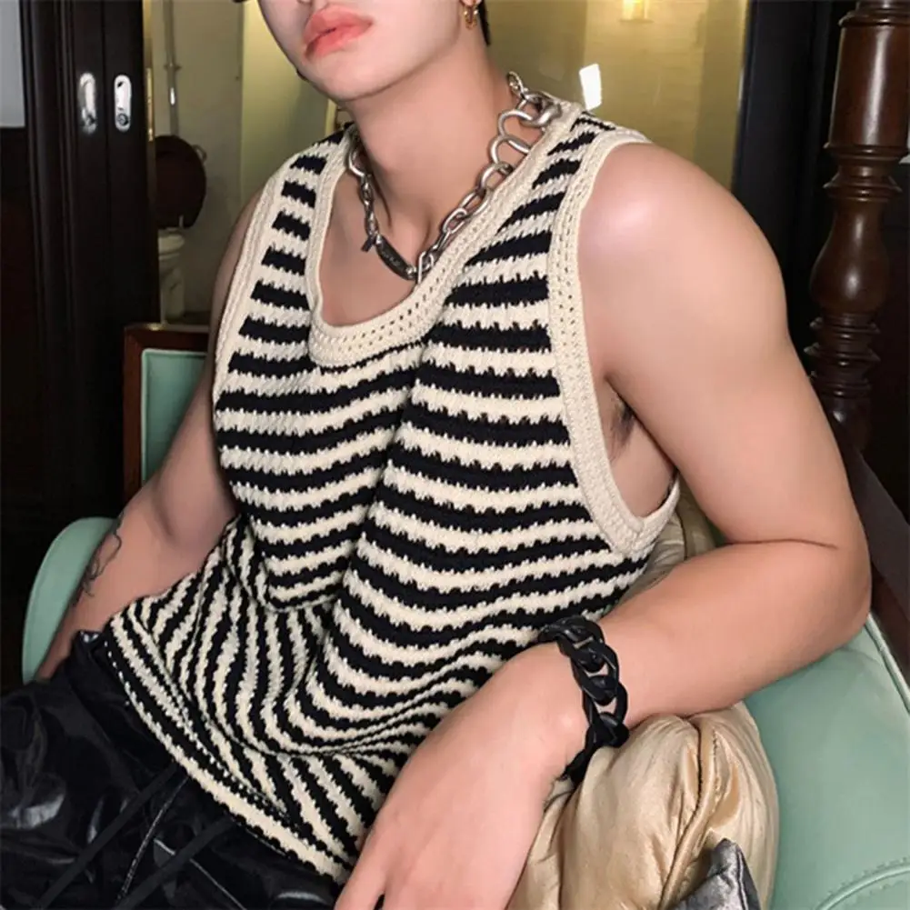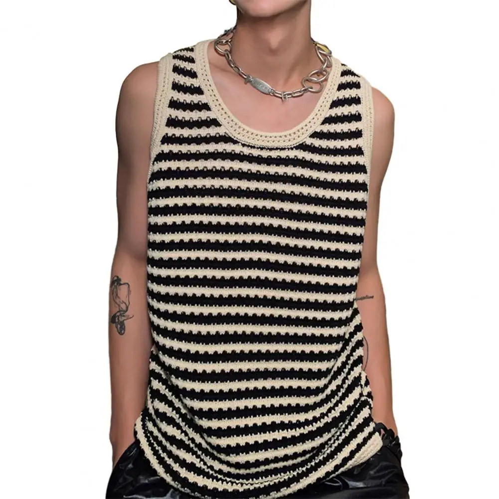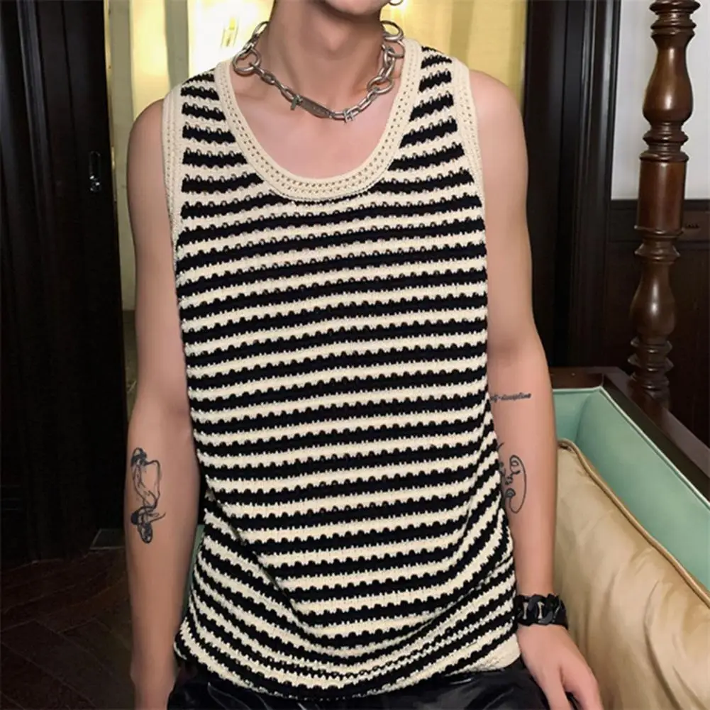 Camiseta sin mangas deportiva, chaleco sin mangas de punto a rayas para hombre, ropa de calle deportiva informal con comodidad transpirable, camiseta sin mangas para hombre