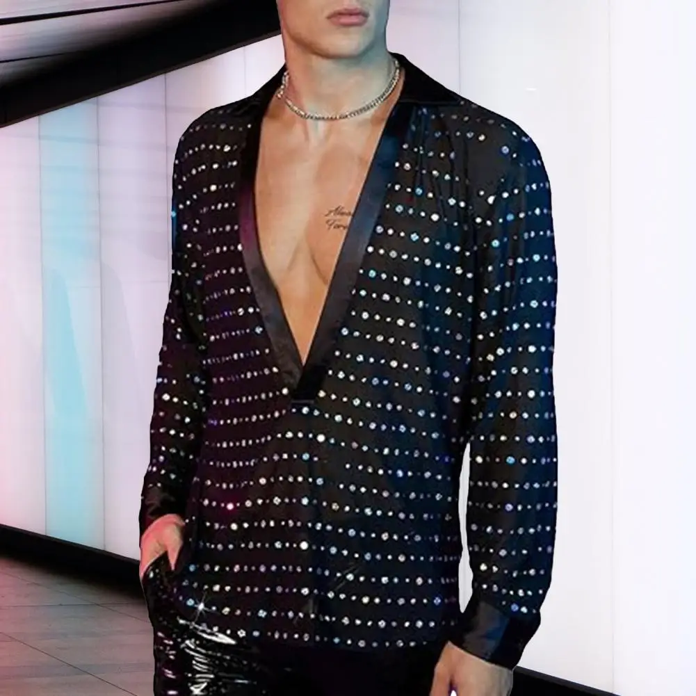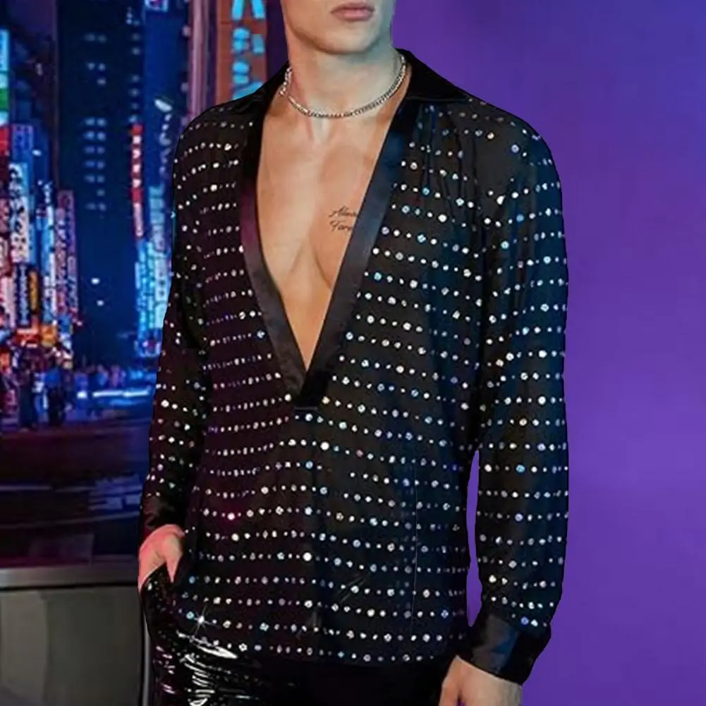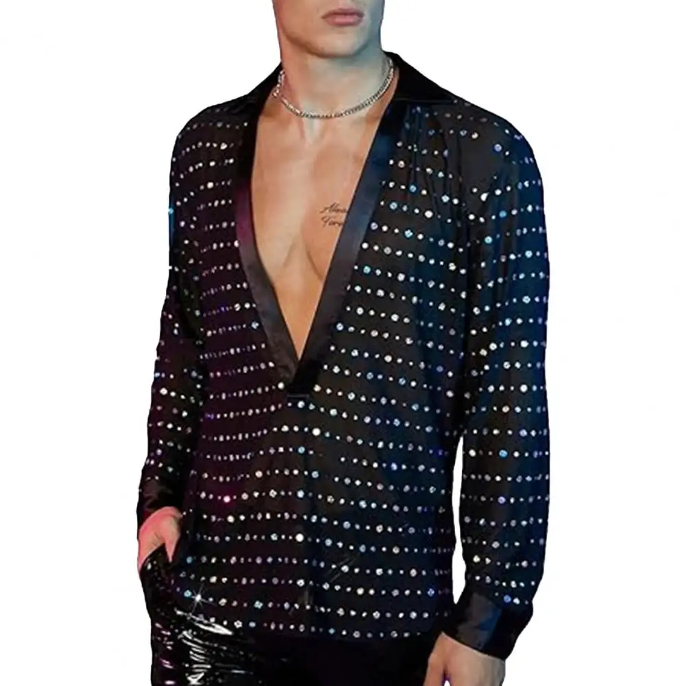 Camiseta transparente para hombre con decoración de lentejuelas para fiesta de baile de discoteca para hombre, elegante cuello en V, manga larga fina, Color sólido para modelo masculino