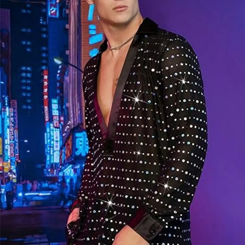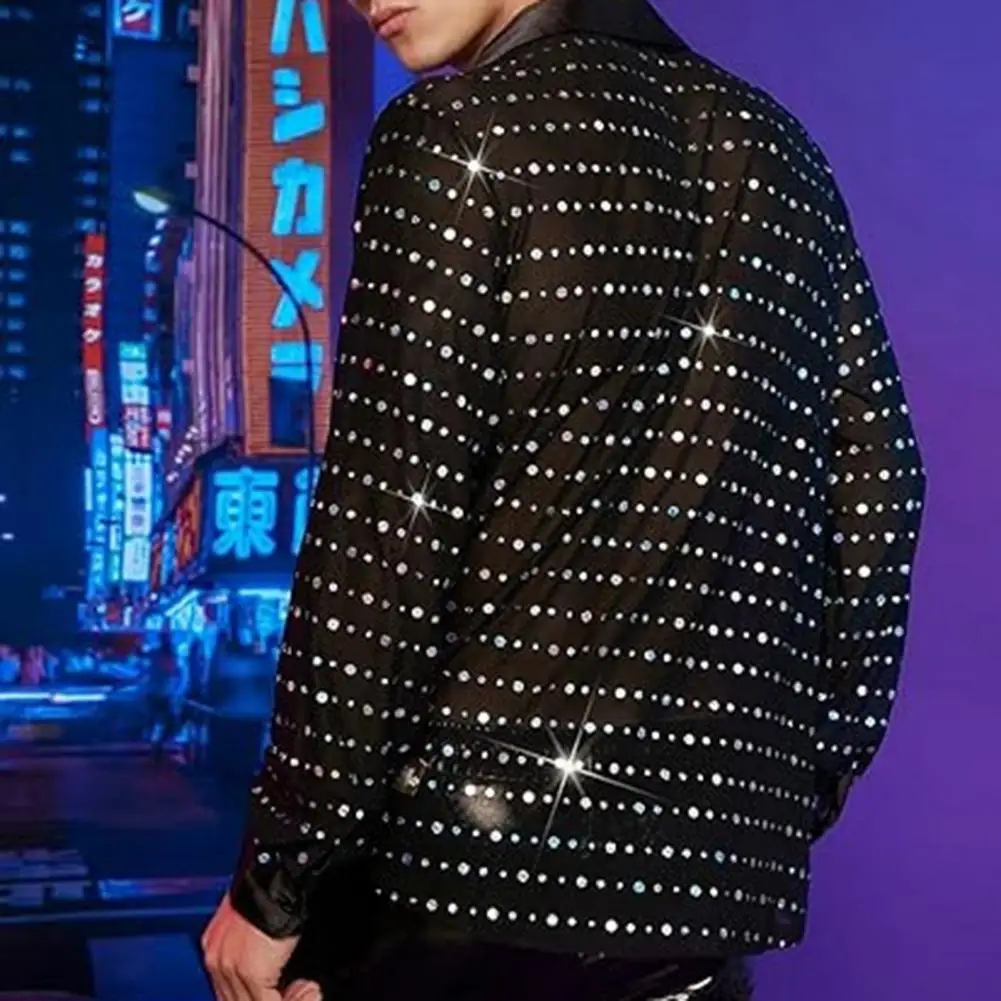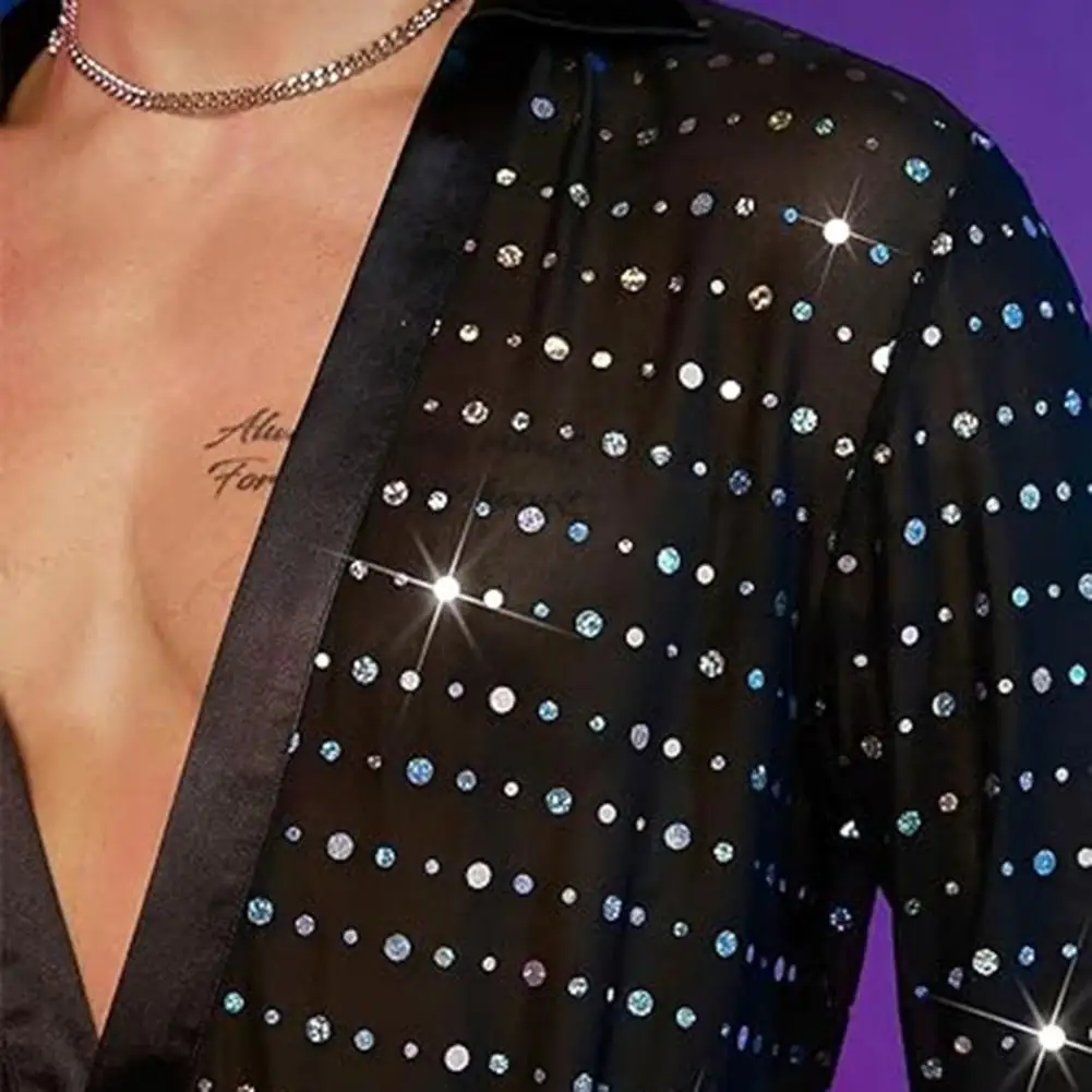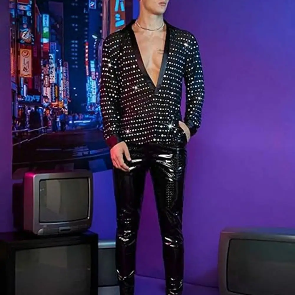Camiseta transparente para hombre con decoración de lentejuelas para fiesta de baile de discoteca para hombre, elegante cuello en V, manga larga fina, Color sólido para modelo masculino