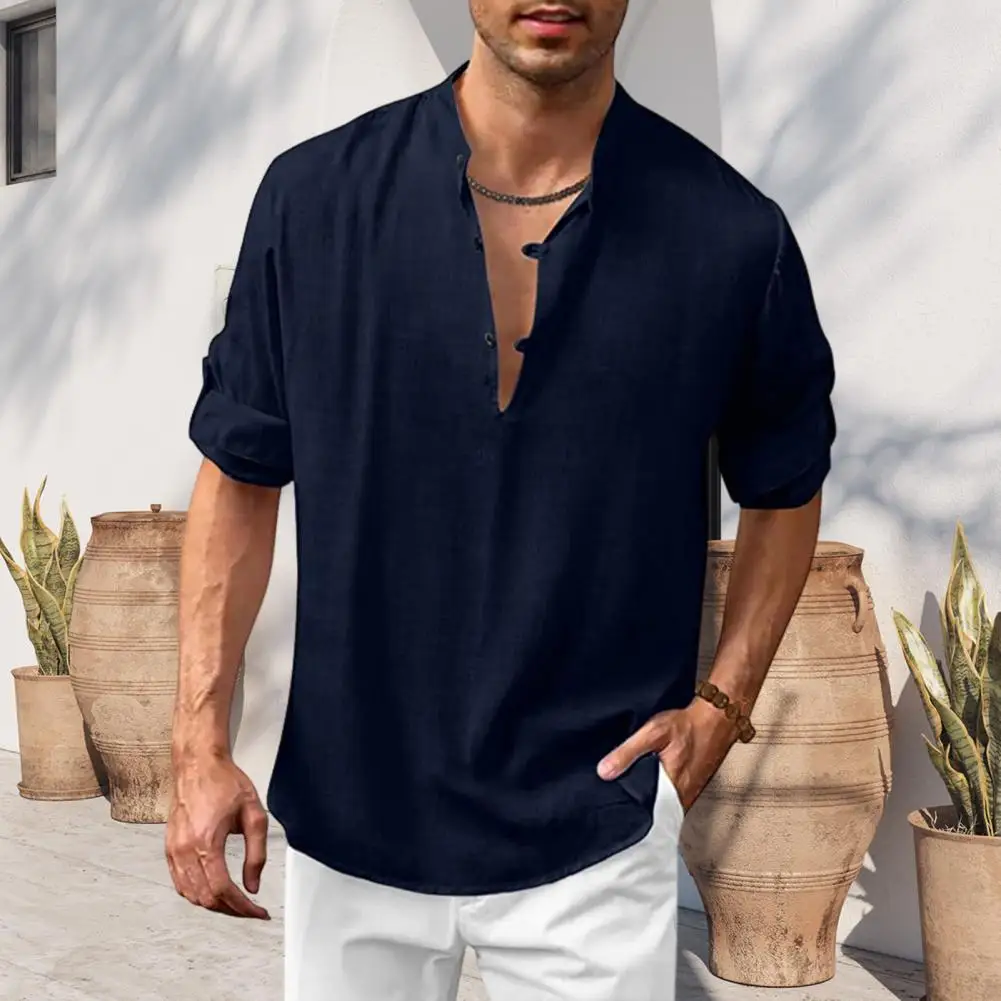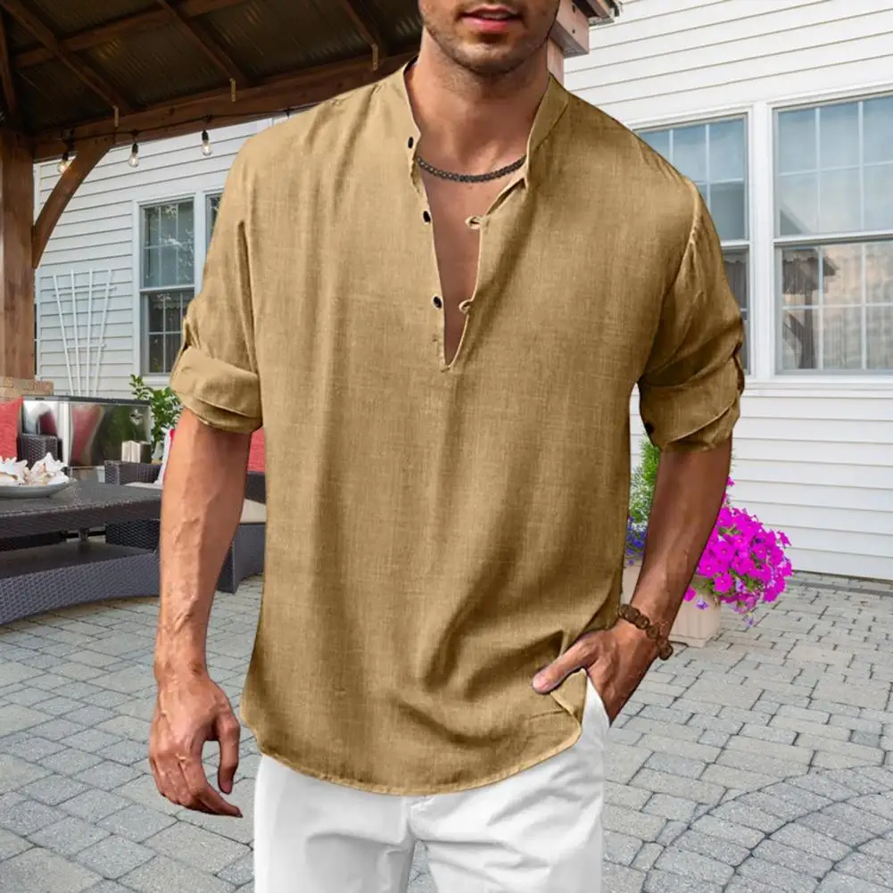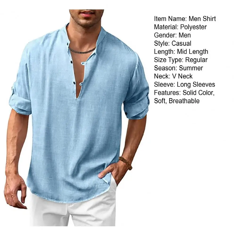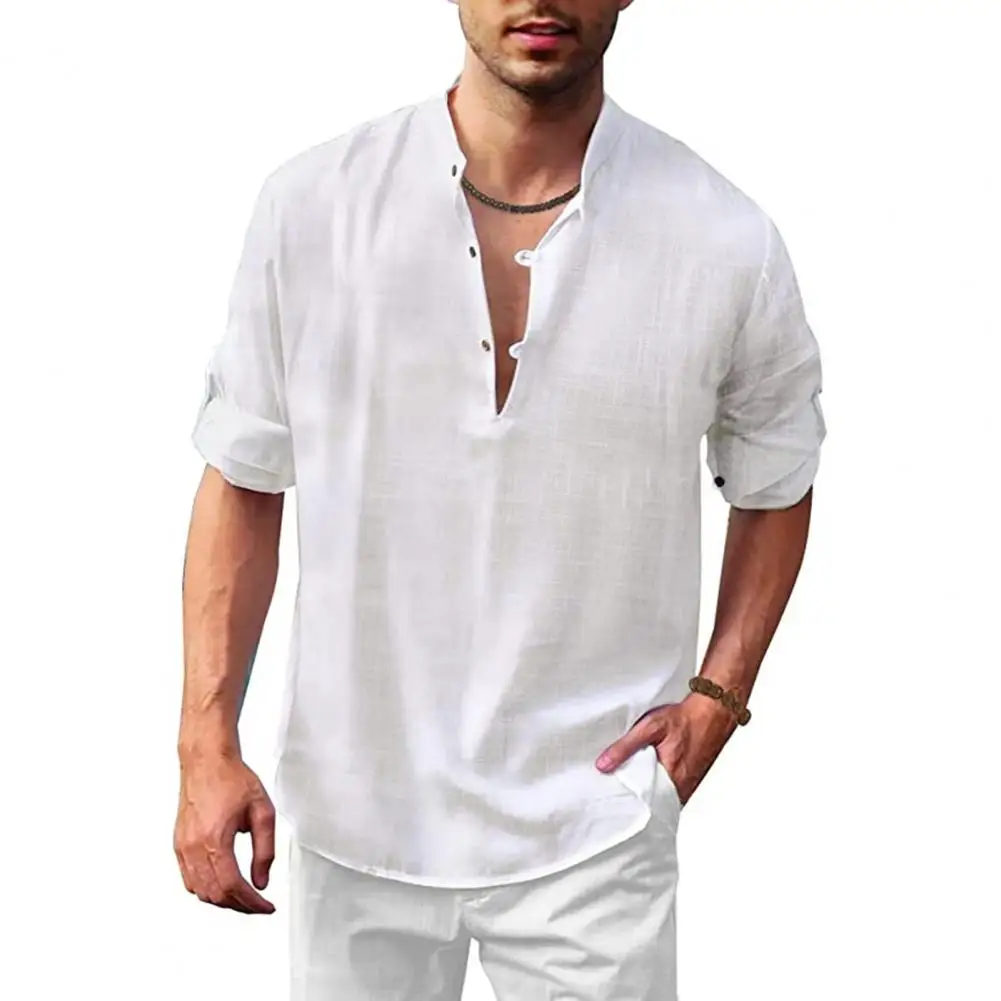 Ropa de verano para hombre, camiseta vintage de manga larga con cuello de pico, tela suave y transpirable, holgada para deportes, ropa de playa informal