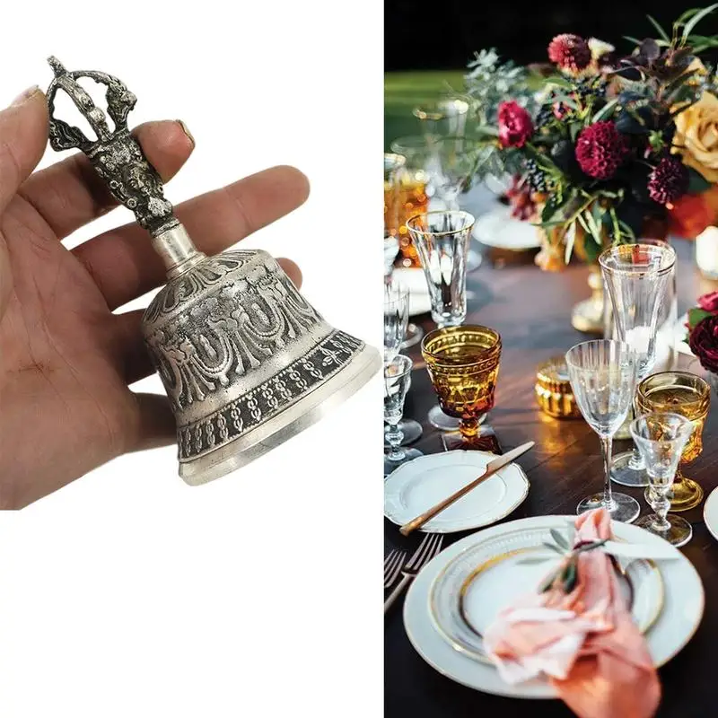 3. Mango ergonómico: Estas campanas de oración de campana de mano tienen un mango ergonómico para un agarre cómodo. La campana de objetos Dharma hecha a mano no se desliza fácilmente de la mano, lo que facilita su uso.