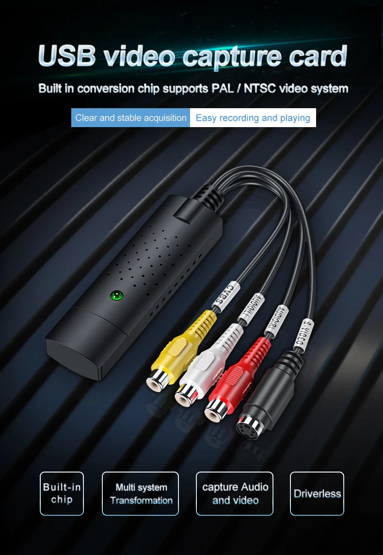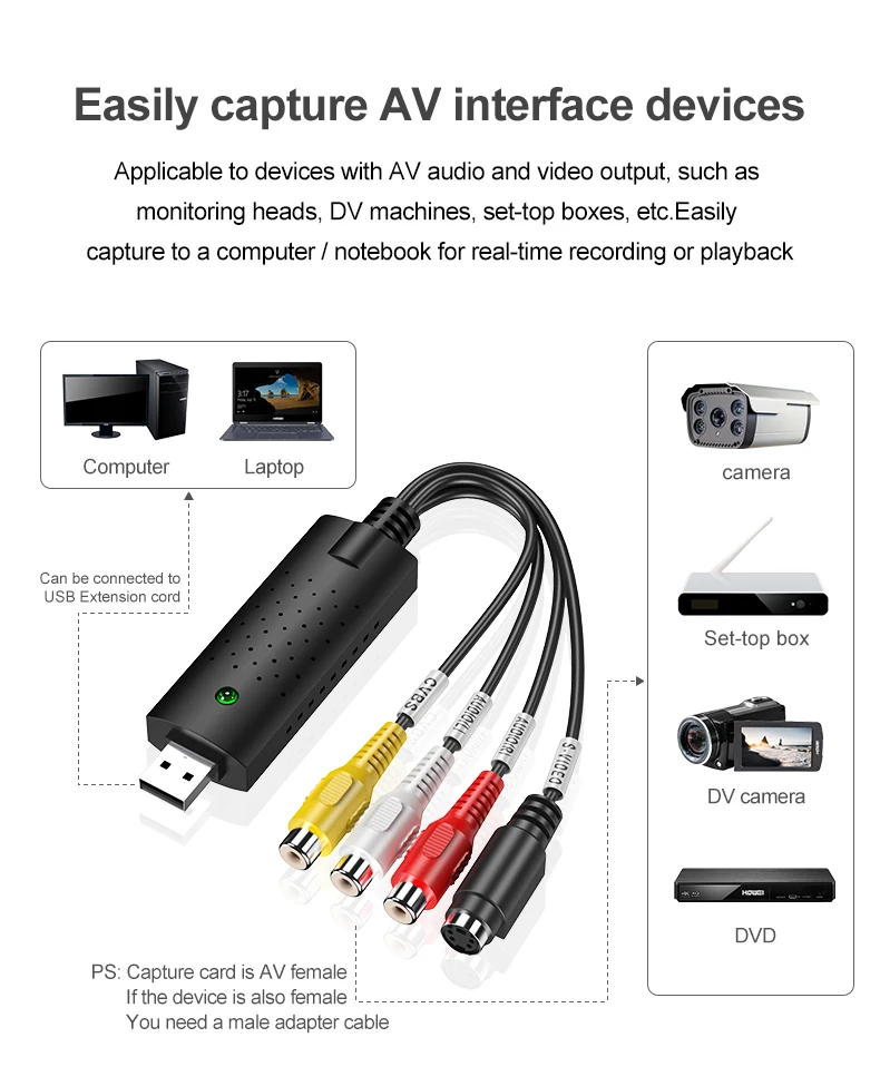 Esta es la tarjeta USB Video Audio EasyCap, que puede capturar archivos de video y audio de alta calidad directamente por la interfaz USB 2,0 sin tarjeta de sonido.El renderizado de alta velocidad y el rendimiento en tiempo real significan menos tiempo de espera y más tiempo de creación. Por cierto, también puede usarlo para crear muchos efectos especiales y archivos de vídeo de clip, etc.