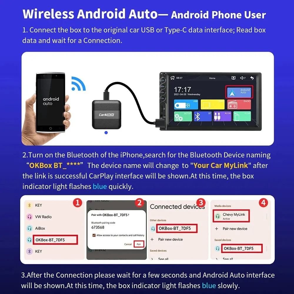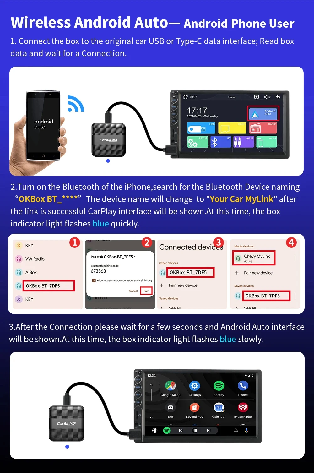 3.Para Android Auto, SoportaAndroid 11 y modelos superiores... Ten en cuenta que los teléfonos móviles Huawei son especiales. Los dispositivos Huawei tienen su propio sistema operativo móvil-EMUI. Desafortunadamente,La conexión inalámbrica automática de Android no es compatible con EMUI.