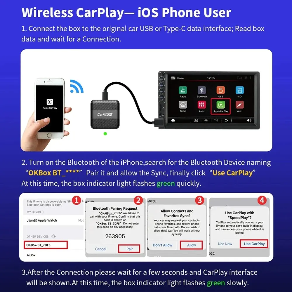 1. Adaptador inalámbrico CarPlay con cable, Diga adiós a los cables. Instalación USB Plug-and-play, estable y rápida, sin necesidad de quitar la radio OEM