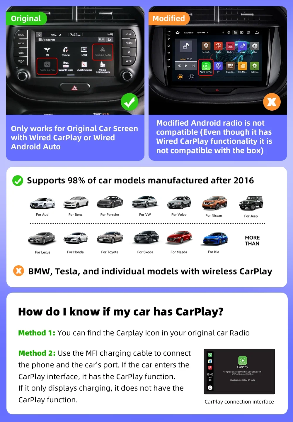 1. Asegúrese deSu coche original tiene CarPlay OEM, Este producto es adecuado para el 98% de los coches con cable Carplay original.BMW,TeslaY algunos modelos sonNo compatible... Si no está seguro. Puede ponerse en contacto con el Servicio de Atención al Cliente para consultar.