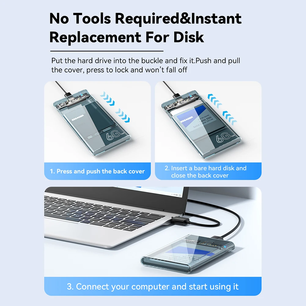 2. Instalación sin herramientas:Con su diseño sin herramientas, esta carcasa de disco duro permite una fácil instalación sin necesidad de herramientas adicionales. La función plug-and-play permite el intercambio en caliente, lo que le permite conectar y desconectar unidades sin reiniciar el ordenador. El indicador LED proporciona señales visuales sobre la actividad y el estado de la conducción.