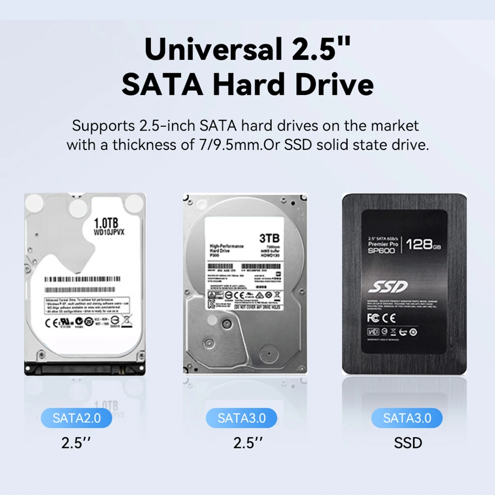 1. Soporte para HDD y SSD SATA I/II/III de 2,5 pulgadas:Esta carcasa de HDD es compatible con todas las unidades de disco duro estándar SATA I/II/III (HDD) y unidades de estado sólido (SSD) de 7mm/9,5mm y 2,5 pulgadas. Admite capacidades de almacenamiento de hasta 6TB (máximo), proporcionando un amplio espacio para sus necesidades de almacenamiento de datos.