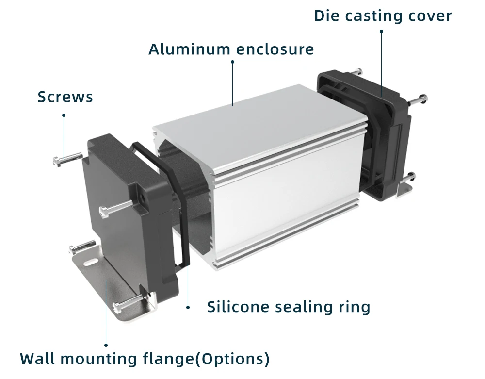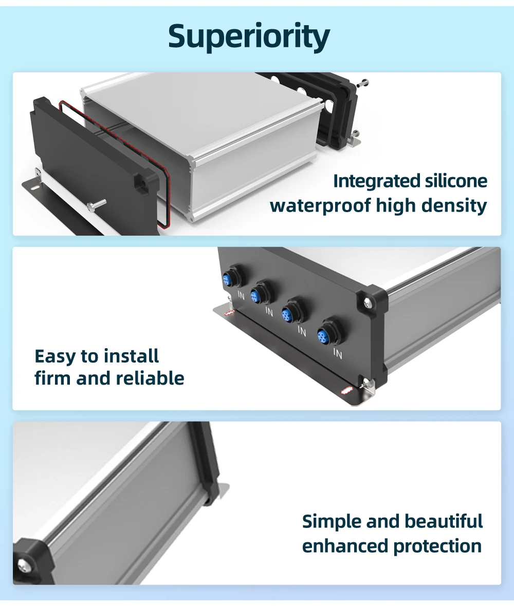Tiene mejores características de impermeabilidad y sellado con anillo de sellado de gel de sílice de una pieza. Carcasa de aluminio extruido, con paneles finales de fundición a presión. Tornillo de acero inoxidable; Buen diseño de tornillos de sellado, tasa de impermeabilidad de hasta IP68;