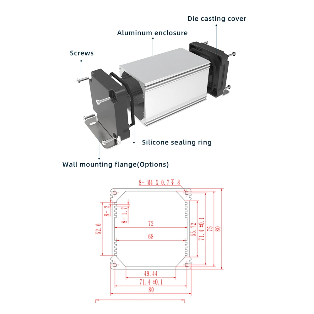 1. Anillo de sellado de silicona integrado2. Personalización de longitud3. Carcasa de aluminio extruido, con paneles finales de fundición a presión4. Buen diseño de tornillos de sellado, tasa de impermeabilidad de hasta IP685. Agujeros de corte y fresado personalizados6. Se aplica al tránsito ferroviario, detección subacuática, equipo de monitoreo exteriorEspecificaciones: