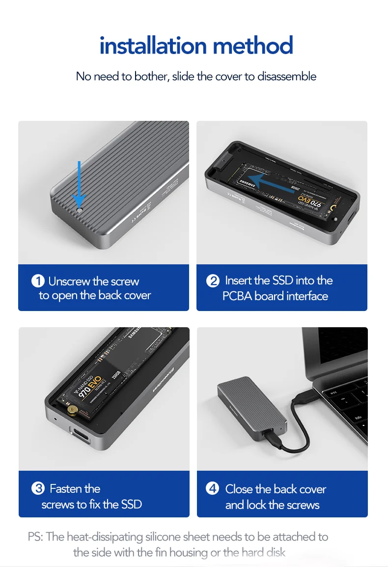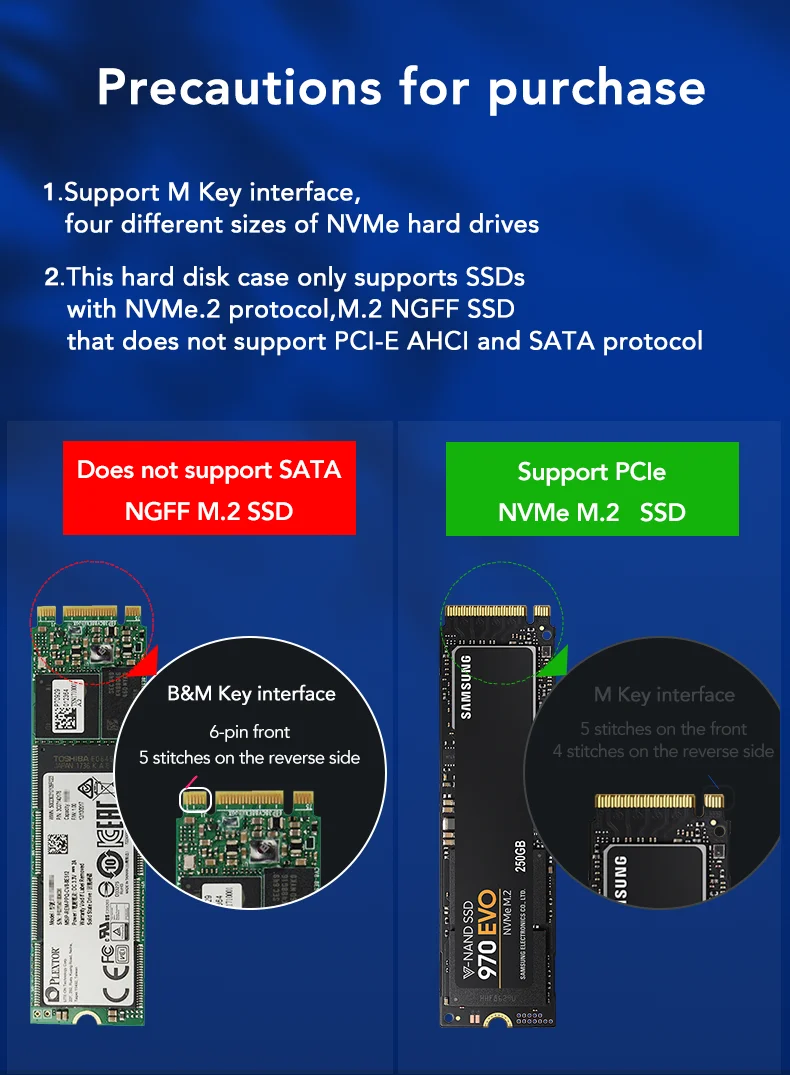 2. El modelo de carcasa NVMe no es compatible con NGFF SATA M.2 SSD y viceversa.