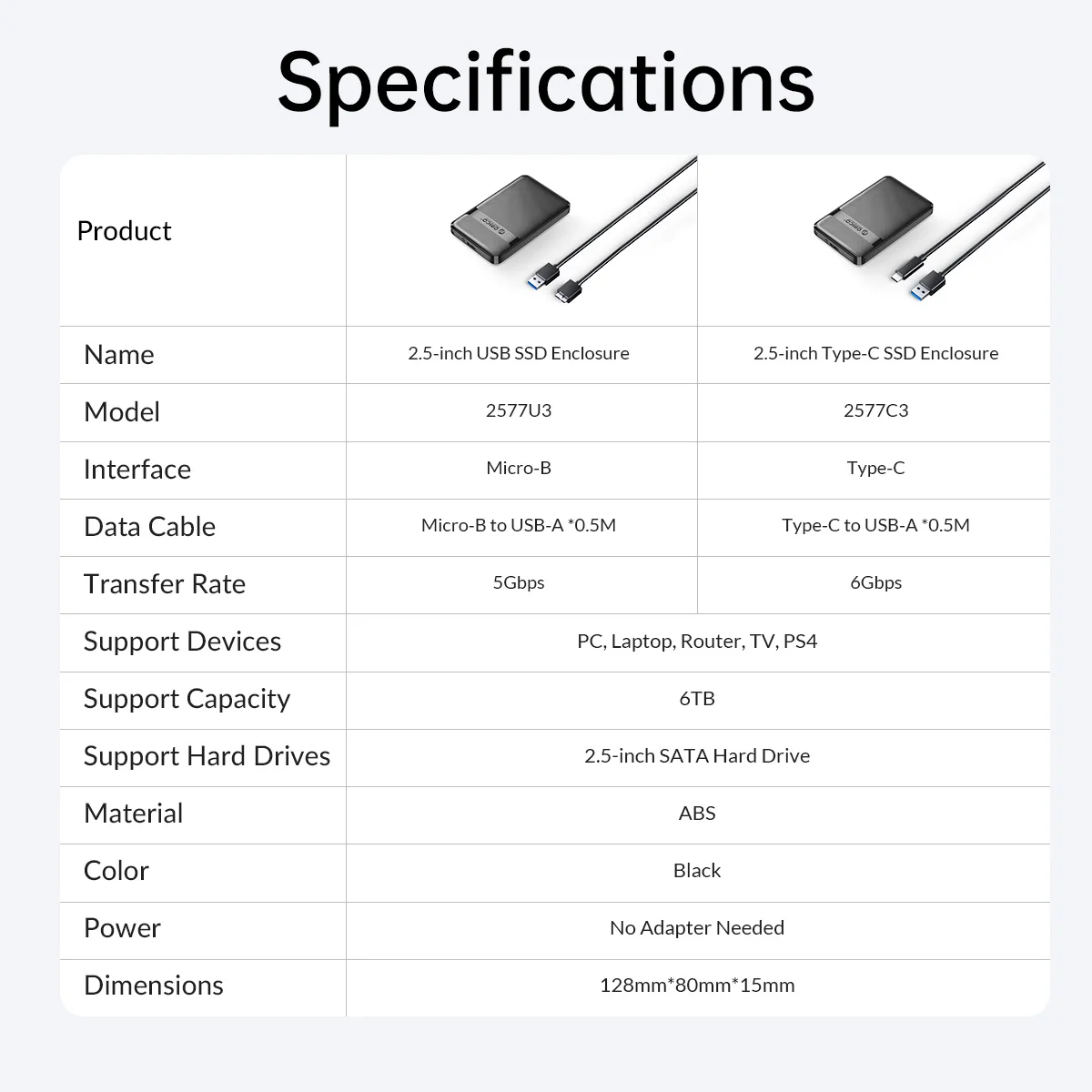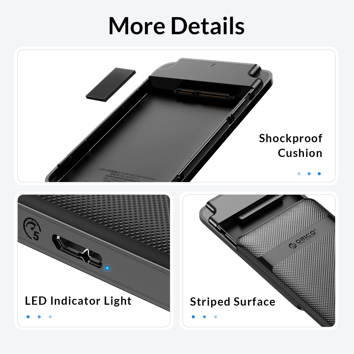 • Compatibilidad SATA de 2,5 pulgadas:Diseñado SATA para discos duros de 2,5 pulgadas, este gabinete ORICO proporciona una forma conveniente de acceder a sus datos de almacenamiento en cualquier momento y en cualquier lugar.