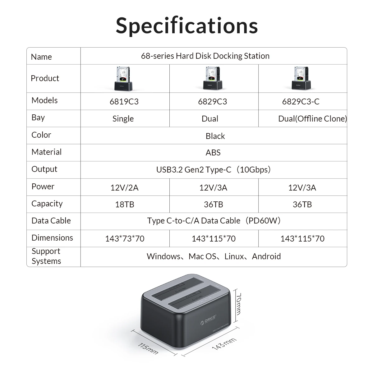 Comprar Carcasa ORICO HDD 3,5 "SATA a tipo C 10Gbps estación de acoplamiento de disco duro compatible con adaptador de corriente UASP 12V3A para HDD/SSD