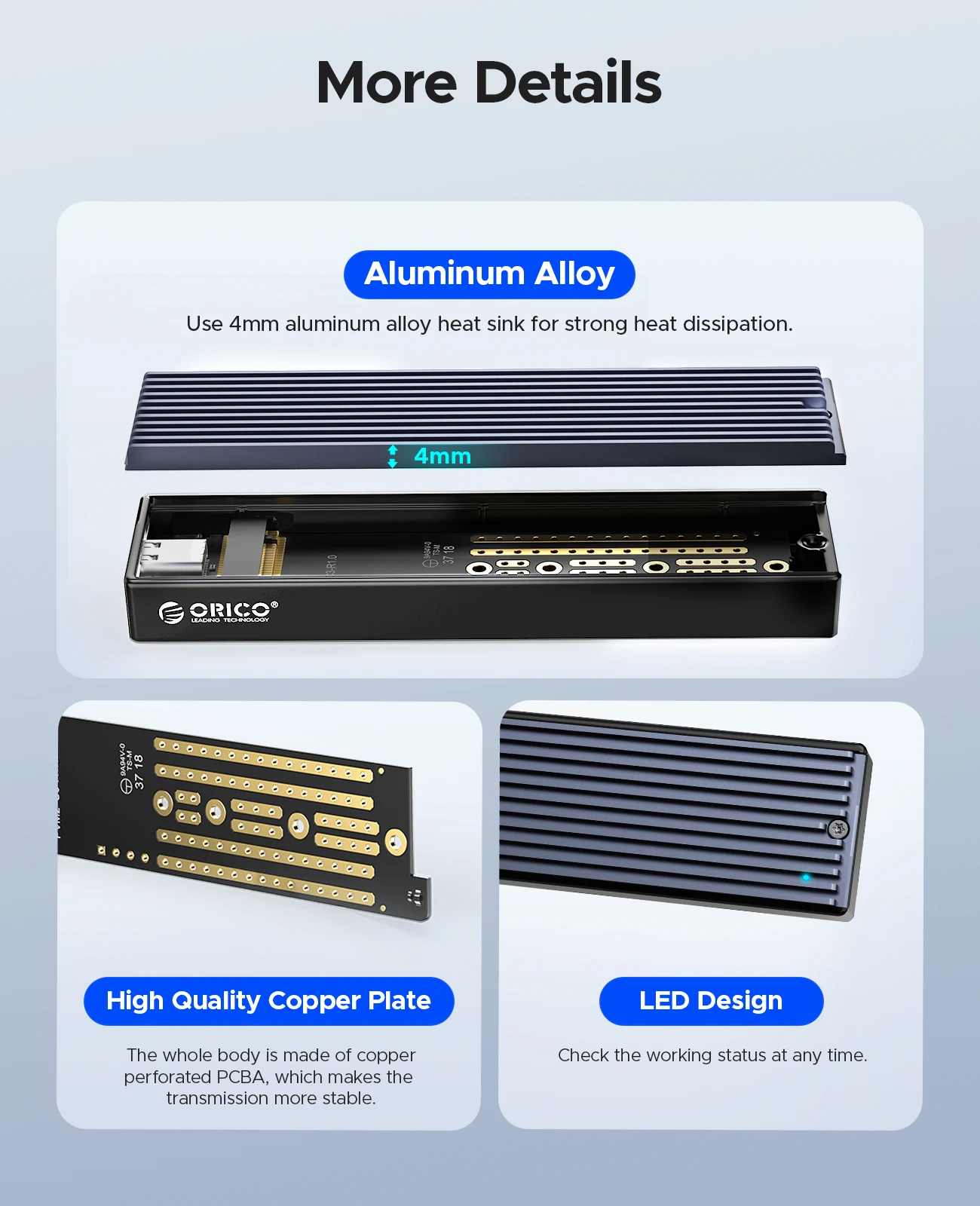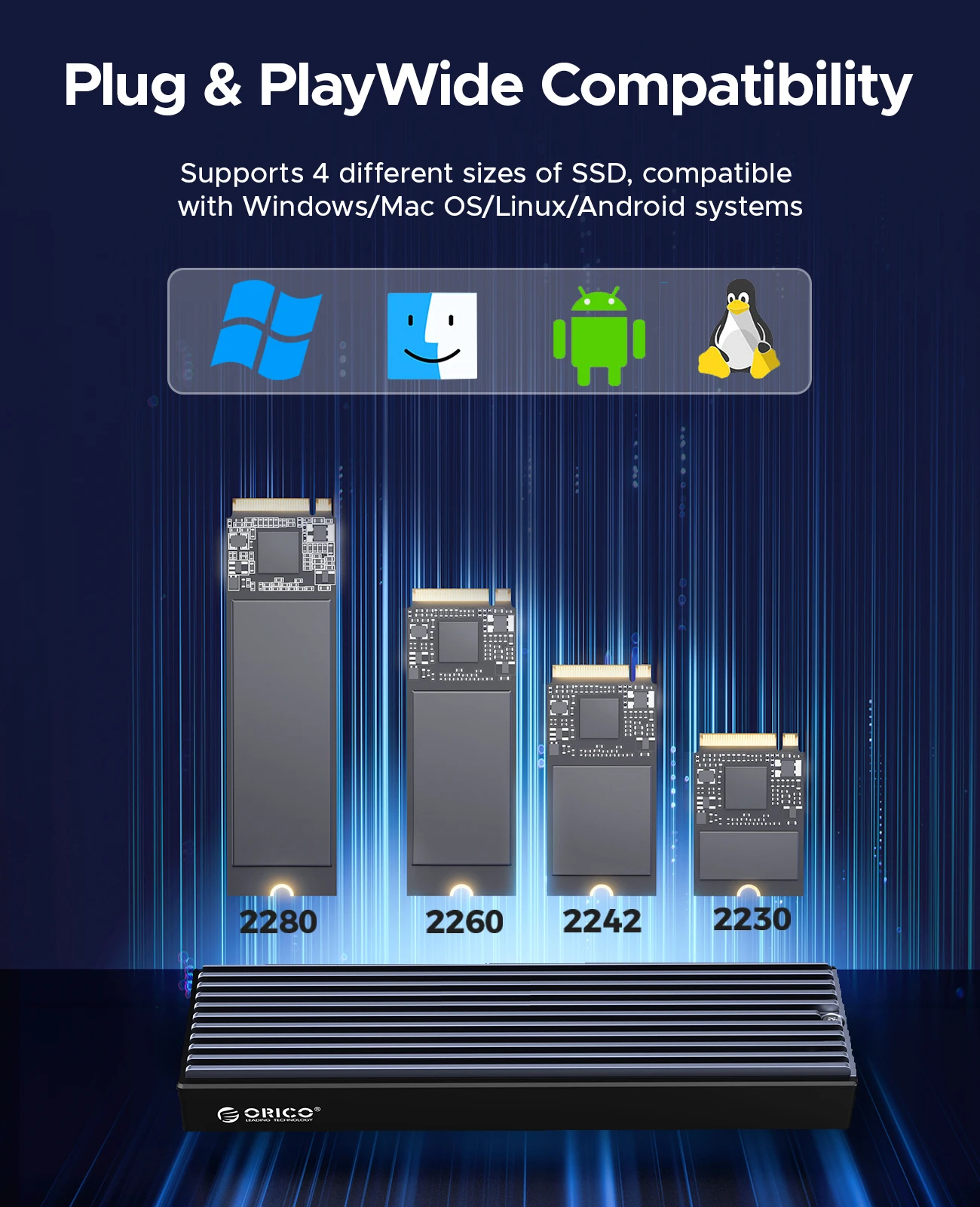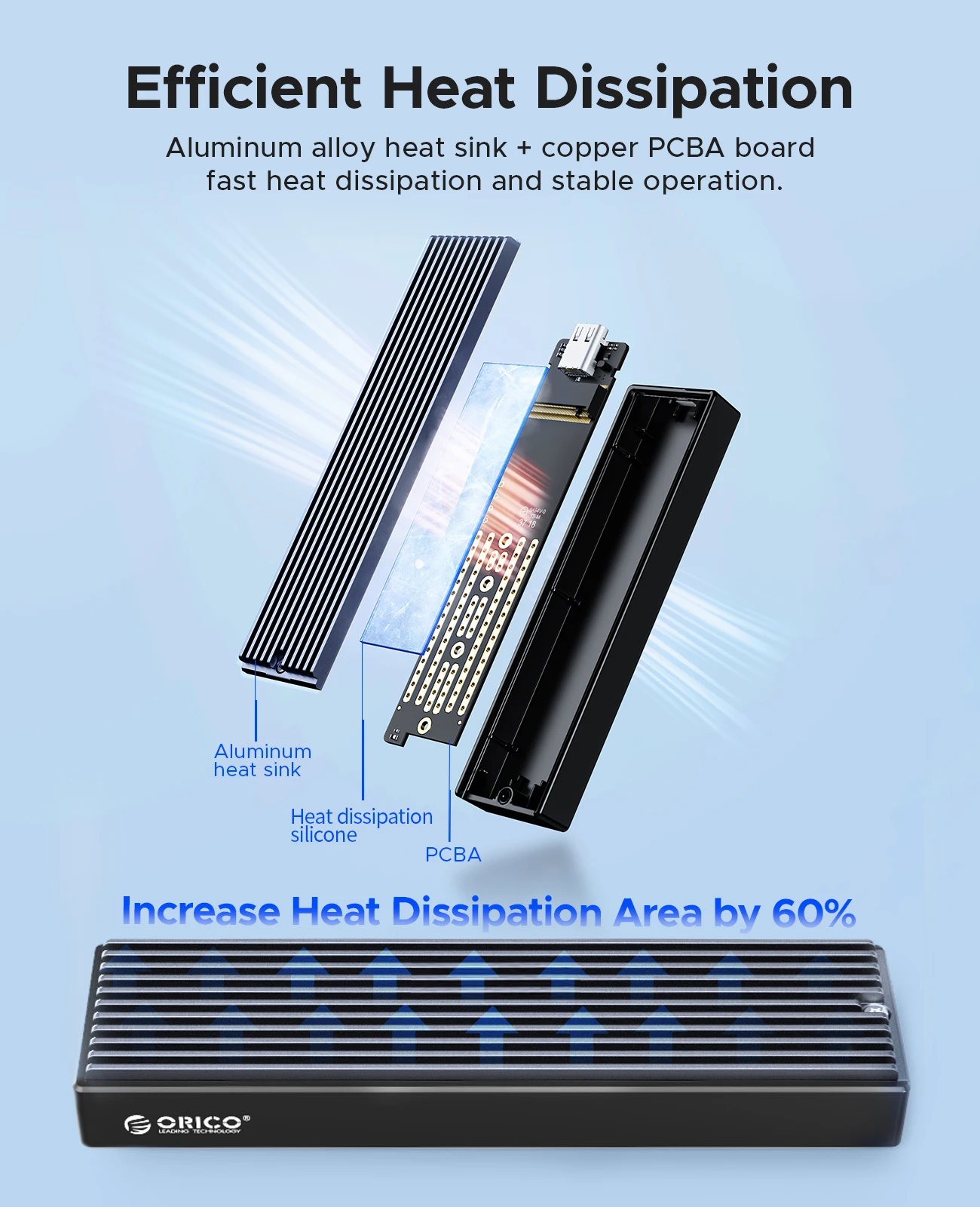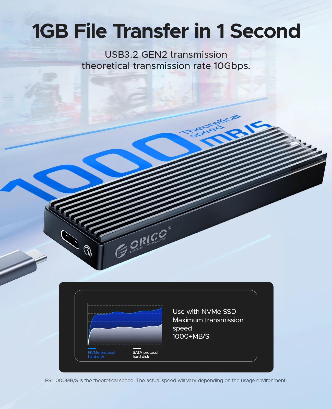 Caja SSD ORICO nvme Utilizando un controlador IC de alto rendimiento, admite el protocolo de aceleración UASP y las funciones Trim, SMART, que pueden mejorar eficazmente la velocidad del SSD, proteger el funcionamiento de los datos y extender la vida útil del SSD.