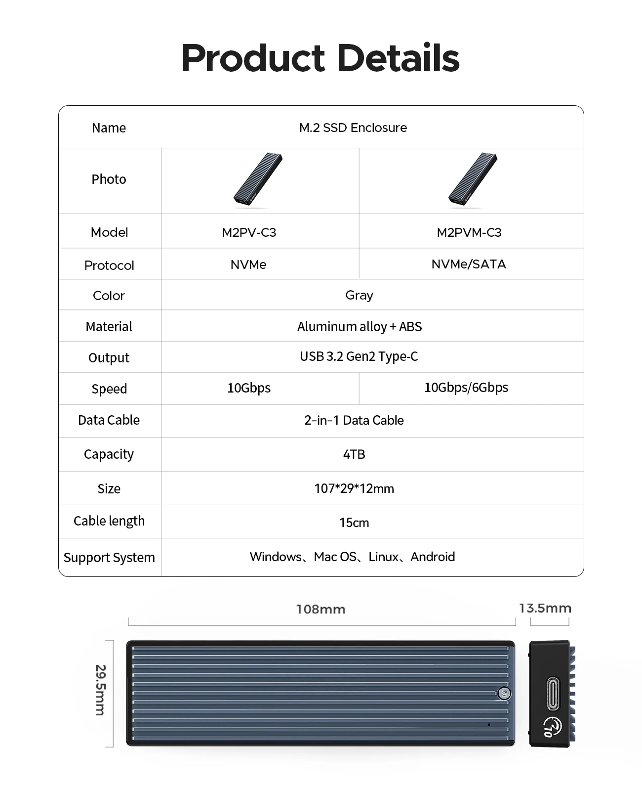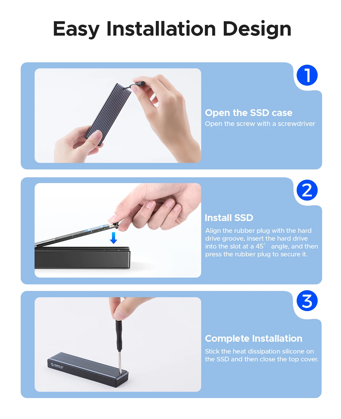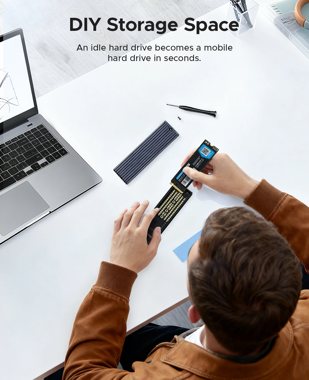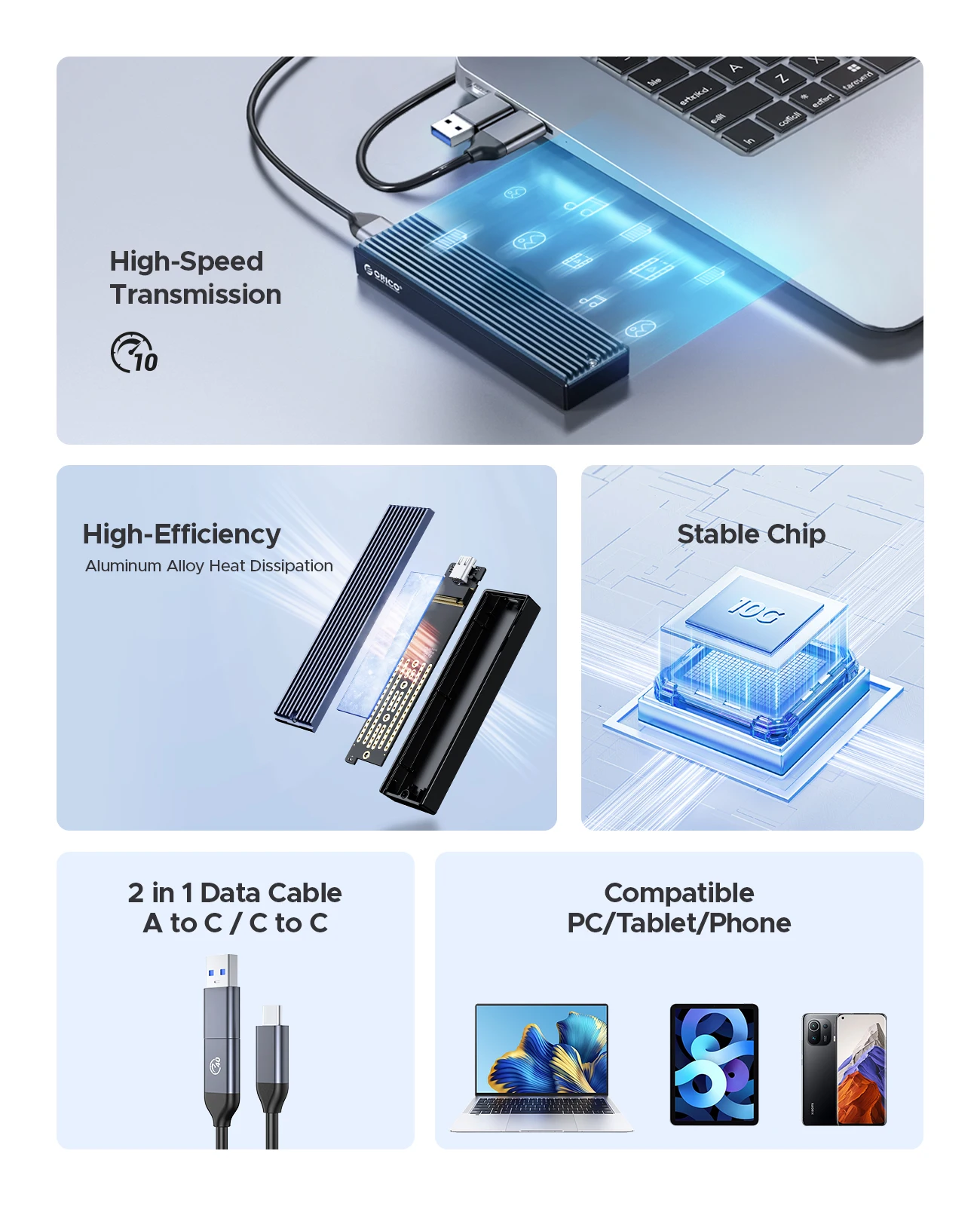 Caja SSD ORICO nvme Utilizando un controlador IC de alto rendimiento, admite el protocolo de aceleración UASP y las funciones Trim, SMART, que pueden mejorar eficazmente la velocidad del SSD, proteger el funcionamiento de los datos y extender la vida útil del SSD.