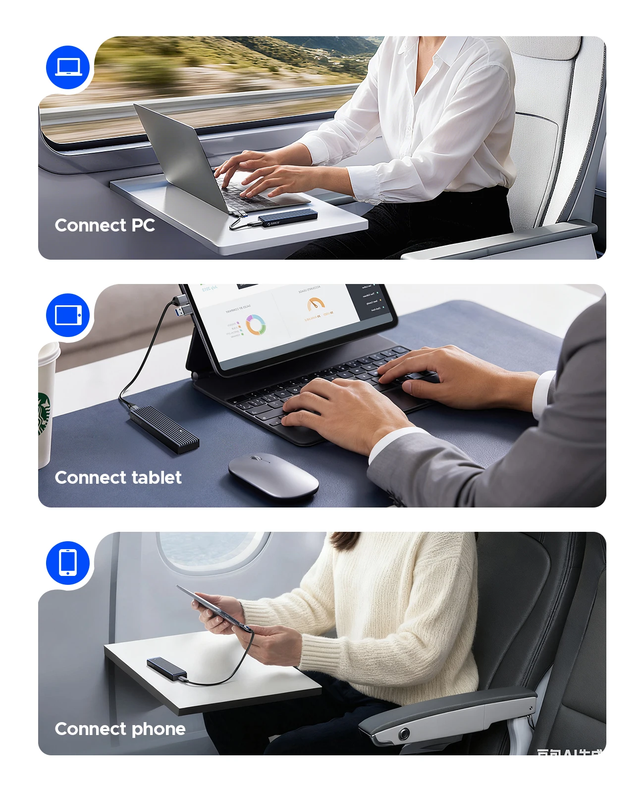 Cuando se utiliza NVMe SSD, la velocidad de transmisión es de 10 Gbps y la velocidad de lectura y escritura es de 1000 MB/s.Cuando se utiliza M.2 SATA SSD, la velocidad de transmisión es de 5 Gbps y la velocidad de lectura y escritura es de 450 MB/s.