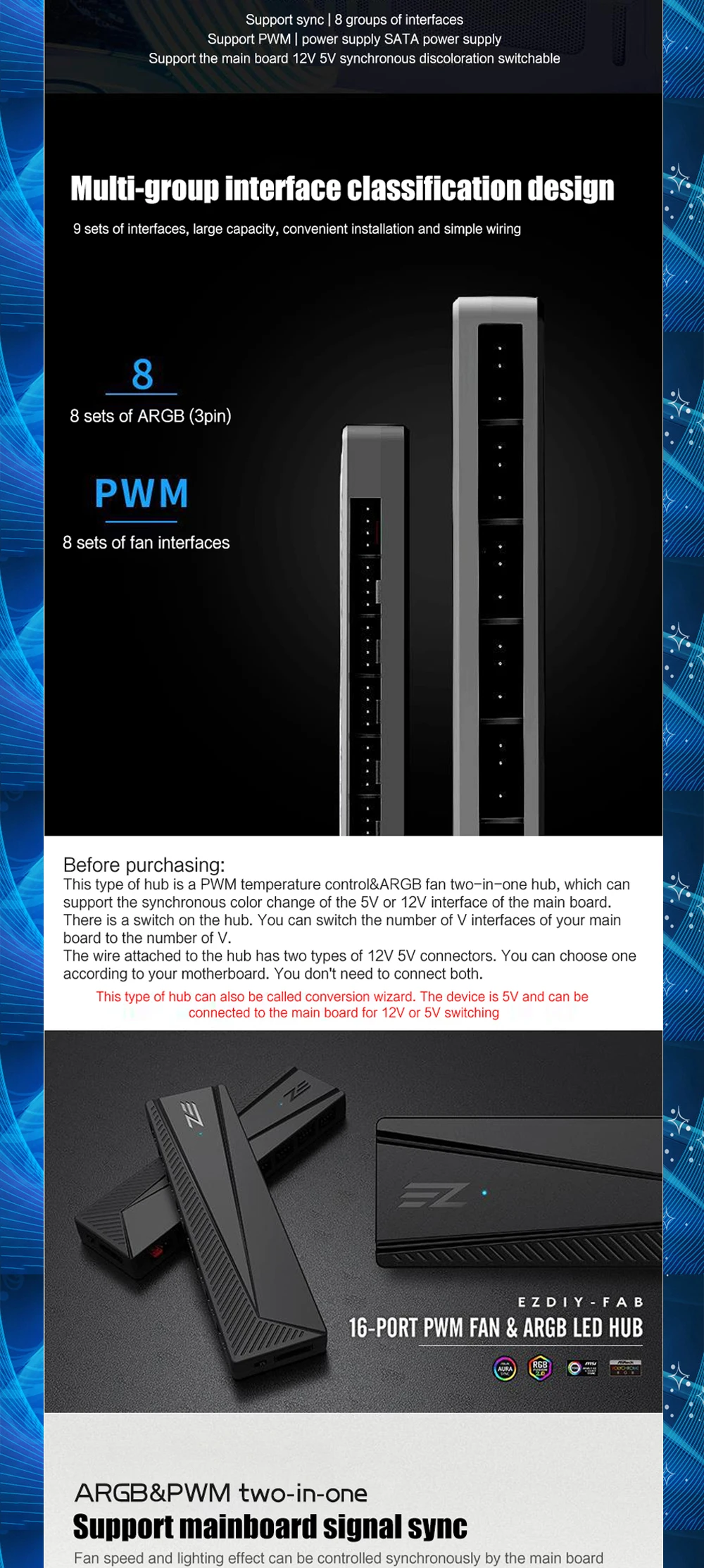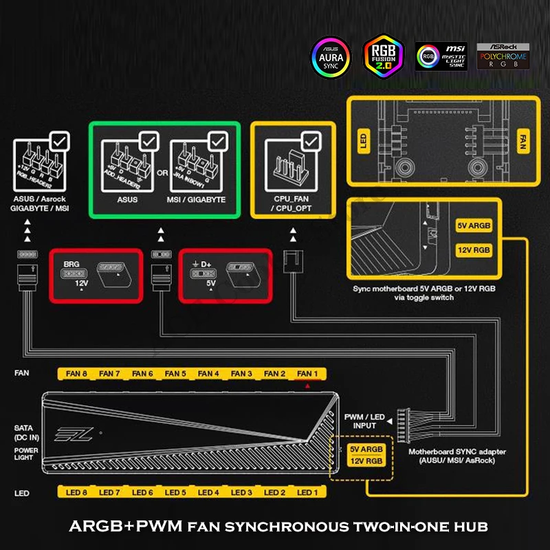 Comprar Carcasa de PC para Gamer, convertidor RGB de 5V a 12V MB SYNC, ARGB PWM y 2 en 1, luz LED y control de velocidad del ventilador