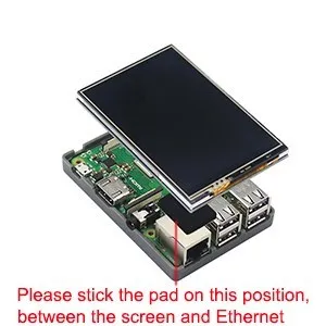 2). Pegue la almohadilla en la parte posterior de la pantalla táctil de 3,5 pulgadas (como se muestra en la imagen), luego inserte la pantalla táctil de 3,5 pulgadas en Raspberry Pi mediante el PIN GPIO correctamente (no se malinterprete)